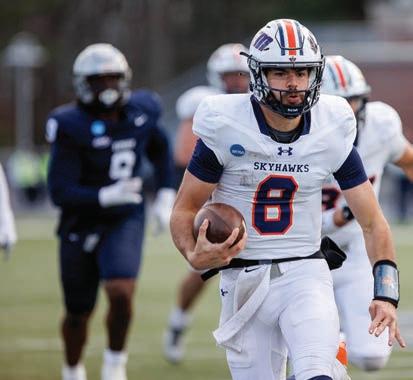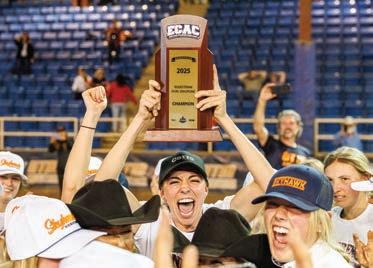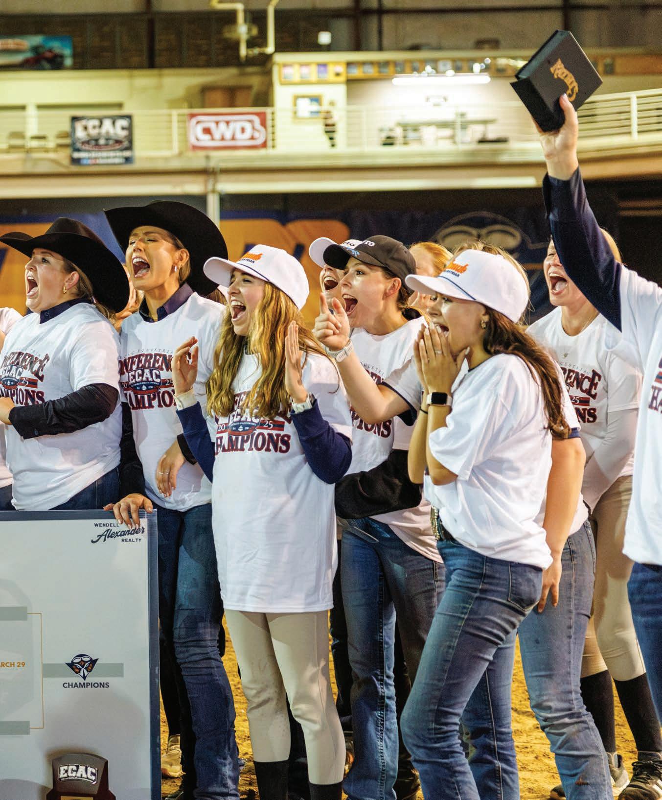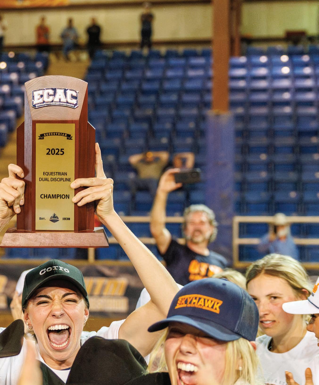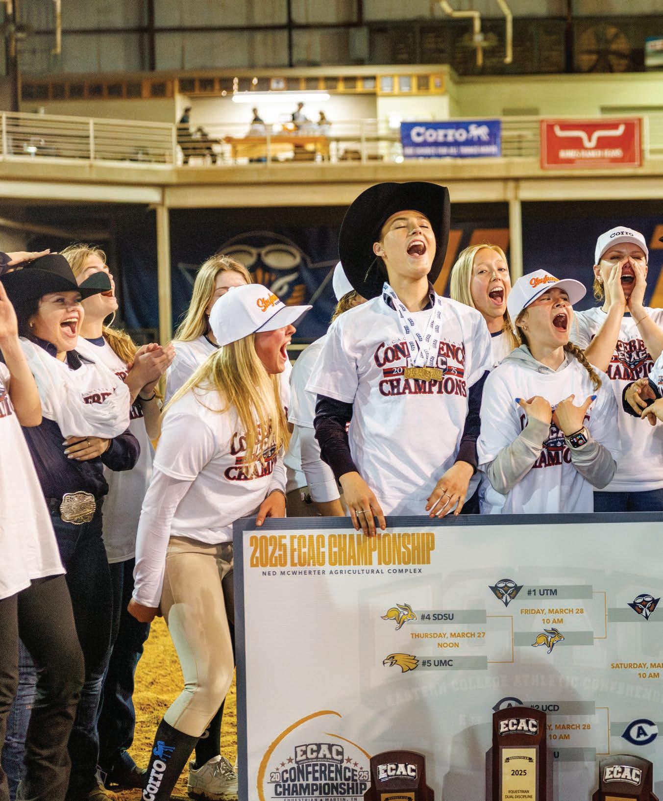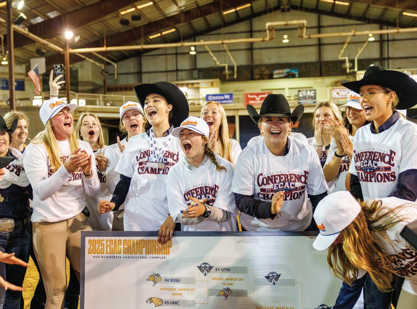 – After four consecutive runner-up finishes, UT Martin’s equestrian team finally hoisted the Eastern College Athletic Conference championship trophy, clinching the 2024-25 title with a dramatic tiebreaker win over UC Davis, their first conference championship since 2013. The Skyhawks earned the crown on raw points after a 10-10 deadlock, with standout rides from Kate Davis ('25), Lexi Bailey ('25), and Logan Putvinski ('24) in reining. The victory secured UT Martin a No. 8 seed in the National Collegiate Equestrian Association Championship, where they later competed against No. 1 seed and reigning national champion Southern Methodist University at the World Equestrian Center in Ocala, Florida. Though the Skyhawks fell to SMU, their historic season and first-ever ECAC title marked a defining moment for the program. Read more on page 18.