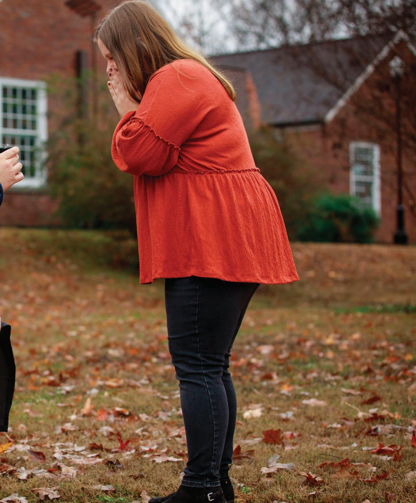 A DEGREE AND AN ENGAGEMENT – Caden Neville (‘22), an Agricultural Business graduate from Mount Juliet, takes a knee outside of UT Martin’s Holland McCombs Center (pictured in the background) and proposes to Kari Beth Woods (‘22), an Agriculture major from Martin, following commencement on Dec. 10, 2022. Neville popped the question by surprising Woods as she arrived at the Hall-Moody Administration Building to take photos. Woods said “yes,” and the pair plan to wed in May.