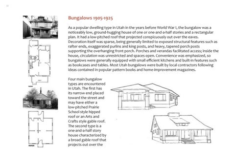 Bungalows 1905-1925 As a popular dwelling type in Utah in the years before World War I, the bungalow was a noticeably low, ground-hugging house of one or one-and-a-half stories and a rectangular plan. It had a low-pitched roof that projected conspicuously out over the eaves. Decoration itself was sparse, being generally limited to exposed structural features such as rafter ends, exaggerated purlins and king posts, and heavy, tapered porch posts supporting the overhanging front porch. Porches and verandas facilitated access; inside the house, circulation was unrestricted and spaces open. Convenience was emphasized, so bungalows were generally equipped with small efficient kitchens and built-in features such as bookcases and tables. Most Utah bungalows were built by local contractors following ideas contained in popular pattern books and home-improvement magazines. Four main bungalow types are encountered in Utah. The first has its narrow end placed toward the street and may have either a low-pitched Prairie School style hipped roof or an Arts and Crafts style gable roof. The second type is a one-and-a-half story house characterized by a broad gable roof that projects out over the
