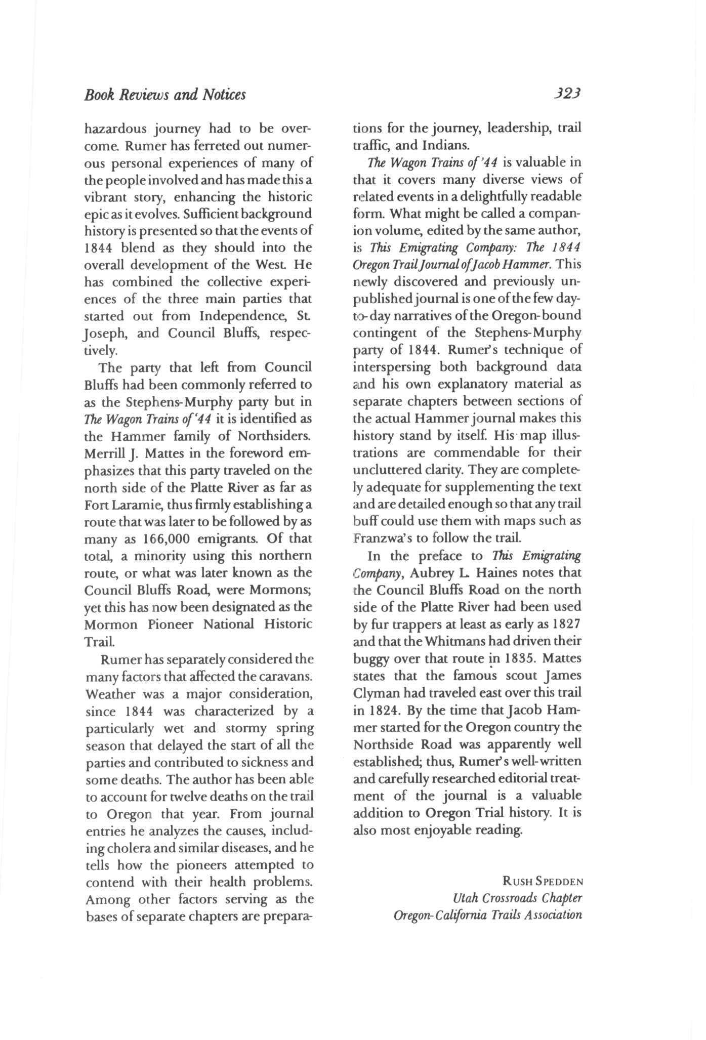 THOMAS A. RUMER. The Wagon Trains of'44: A Comparative View ofthe Individual Caravans in the Emigration of 1844 to Oregon; and THOMAS A. RUMER, ed. This Emigrating Company:The 1844 Oregon Trail Journal ofJacob Hammer RUSHSPEDDEN 322