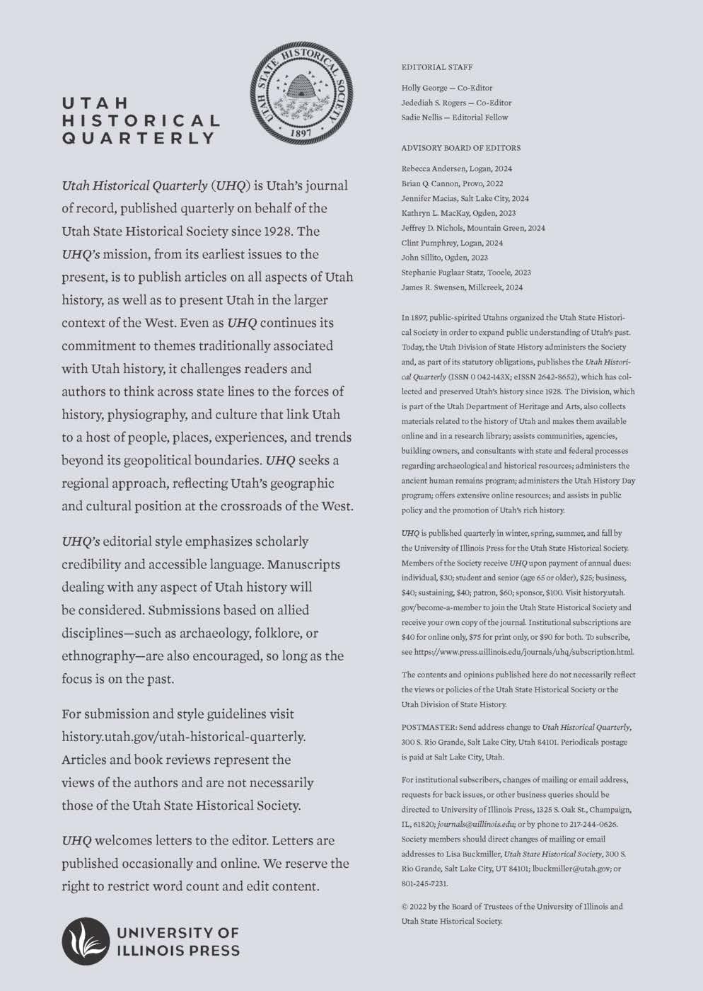 On summer evenings, LeGrande Davies and his grandfather Otto Kesler loved to sit outside their Cove Fort home and watch the sunset, while a group of coyotes began its serenade. Davies recalled that “‘Grandpa would always say, “Ah. Can’t they sing well. Can’t they sing well.” There was a peacefulness that would come because the wind quits blowing in the evening.’” So notes Rebecca Andersen in the opening article of the spring 2022 Utah Historical Quarterly, which focuses on land in the Intermountain West and a handful of the entities—whether personal, familial, or corporate—that have made a living off it. The action in this issue takes place mainly in Utah but also in Nevada, Wyoming, and other neighboring states, on the traditional homelands of Indigenous tribes, a testament to the reality that watersheds, economies, and interpersonal networks do not always adhere to neat political boundaries.