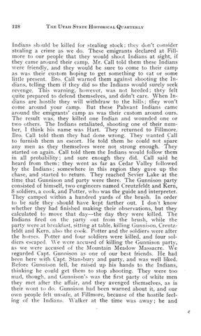 Indians should be killed for stealing stock; they don't consider stealing a crime as we do. These emigrants declared at Fillmore to our people that they would shoot Indians at sight, if they came around their camp. Mr. Call told them these Indians were friendly, and they would be sure to come to their camp as was their custom hoping to get something to eat or some little present. Bro. Call warned them against shooting the Indians, telling them if they did so the Indians would surely seek revenge. This warning, however, was not heeded; they felt quite prepared to defend themselves, and didn't care. When Indians are hostile they will withdraw to the hills; they won't come around your camp. But these Pahvant Indians came around the emigrants' camp as was their custom around ours. The result was, they killed one Indian and wounded one or two others. The Indians retaliated, shooting one of their number, I think his name was Hart. They returned to Fillmore. Bro. Call told them they had done wrong. They wanted Call to furnish them an escort. He told them he could not spare any men as they themselves were not strong enough. They started on again. Call told them the Indians would follow them in all probability; and sure enough they did. Call said he heard from them; they went as far as Cedar Valley followed by the Indians; somewhere in this region they gave up the chase, and started to return. They reached Sevier Lake at the time that Gunnison and party were there. The Gunnison party consisted of himself, two engineers named Creutzfeldt and Kern, 8 soldiers, a cook, and Potter, who was the guide and interpreter. They camped within a hundred yards of the brush. In order to be safe they, should have kept farther out. I don't know whether they had finished making their observations, but they calculated to move that day—the day they were killed. The Indians fired on the party out from the brush, while the party were at breakfast, sitting at table, killing Gunnison, Creutzfeldt and Kern, also the cook. Potter and the soldiers were after the horses. Potter and four soldiers were killed, and four soldiers escaped. We were accused of killing the Gunnison party, as we were accused of the Mountain Meadow Massacre. We regarded Capt. Gunnison as one of our best friends. H e had been here with Capt. Stansbury and party, and was well liked. Before Gunnison fell, he raised up his hands to the Indians, thinking he could get them to stop shooting. They were too mad, though, and Gunnison's was the first party of white men they met after the affair, and they avenged themselves, as is their wont to do. Gunnison had been warned about it, and our own people felt unsafe, at Fillmore, because of the hostile feeling of the Indians. Walker at the time was away; he and