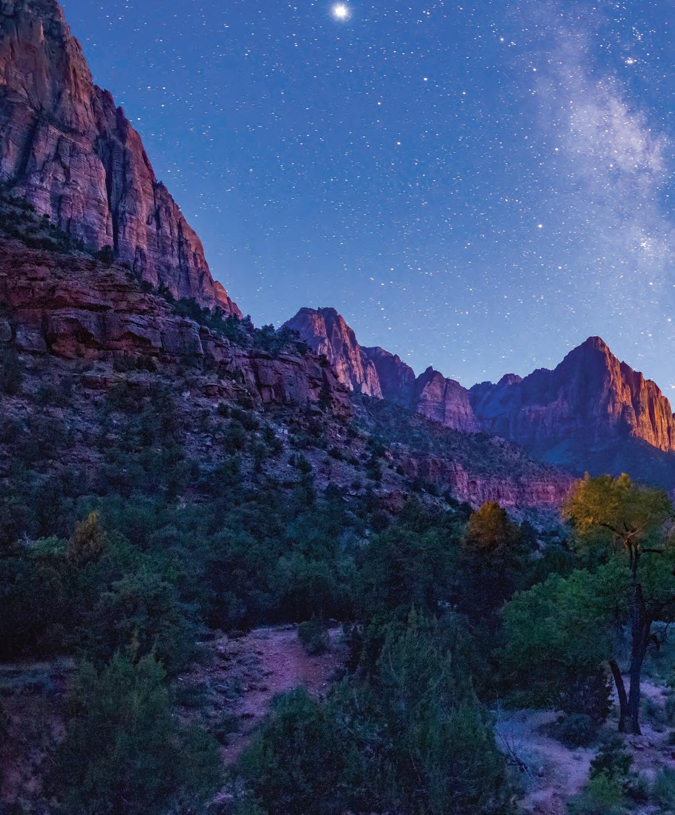 three primary areas of focus are policy, environmental justice, and cultural anthropology—the study of human societies and culture and their development. These important efforts do more than just improve stargazing, says Mendoza. Light pollution destroys wildlife habitat, is linked to myriad human diseases, and wastes public funds on inefficient lighting systems. Additionally, astrotourism is projected to generate nearly $6 billion and employ 113,000 people in the Southwest in 10 years, per the Utah Office of Tourism. This nighttime photo of Zion National Park was taken by DarkSky International Director of Engagement Bettymaya Foott HBS’15.