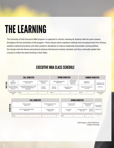 THE LEARNING The University of Utah Executive MBA program is organized in cohorts, meaning all students take the same classes throughout the five semesters of the program. These classes teach analytical methods and conceptual tools from finance, statistics, behavioral science, and other academic disciplines to improve leadership and problem-solving abilities. Our faculty write the theory and practical solutions that become industry standard, and they continually update their courses to reflect the latest thinking in their fields.