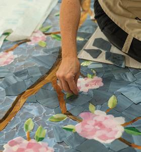 Highly customized installation. For us, it’s not just tile, it’s art. We’re doing mosaics with New Ravenna tiles in stone or glass. We’re installing tiles to look like aspen trees filled with birds. And, we just finished an accent microwave cubby to match chinoiserie wallpaper. We make your dreams come true with tile.