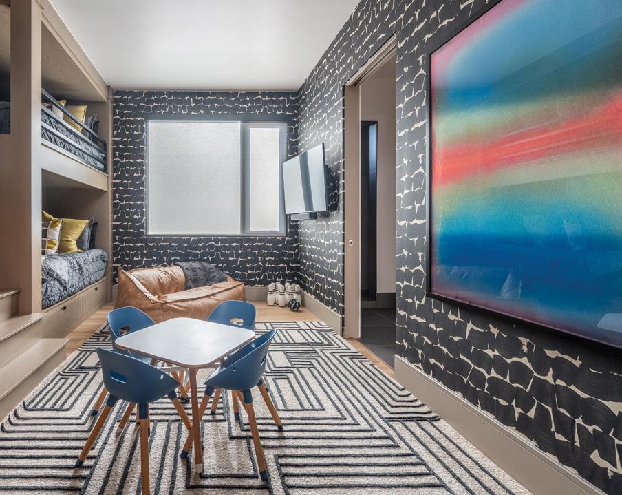 Photographer: Lindsay Salazar, lindsaysalazar.com; Interior Design: Bond Design Company, bonddesigncompany.com; Builder: Bailey Construction, Park City, baileyconstructionpc.com; Cabinetry: Pepper Tree Kitchen & Bath, West Jordan, peppertreekitchen.com; Stone Slabs: Italia Granite, Murray, igsmontana.com/home-slc ; Slab Fabrication: Granite Kings, SLC, utahgranitekings.com; Window Treatments: Intrigue Window Fashions, instagram. com/intriguewindowfashions; Artwork: Jordan Daines, jordan-daines.com; Plumbing: Waterworks via MLD, SLC, mld.com; Lighting: Visual Comfort, visualcomfort.com, and Lightology, lightology.com; Wallcoverings: Holly Hunt, hollyhunt.com, Holland & Sherry, hollandandsherry.com, Winfield Thybony, winfieldthybony.com, and Phillip Jeffries, phillipjeffries.com; Tile Mosaics: Tile Bar, tilebar.com, Soho Studio, sohostudiocorp.com, New Ravenna, newravenna.com, and Ann Sacks, annsacks.kohler. com; Sofa: Rene Cazares, renecazares.com; Coffee Table: Interlude Home, interludehome.com; Dining Table: Shine by Sho, shomodern.com; Banquette, Chairs and Bedframe: Hickory Chair, hickorychair. com; Range: La Cornue, lacornueusa.com; Cabinet Hardware: Rocky Mountain Hardware, Idaho, rockymountainhardware.com; Ping Pong Table: Eleven Ravens, 11ravens.com;