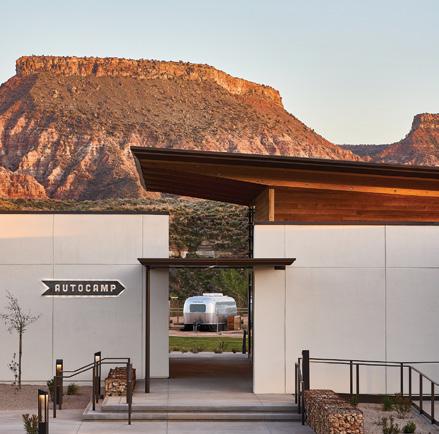 Just twenty minutes from Zion’s park entrance, Autocamp Zion is a charming basecamp for your adventure. Stay in refurbished Airstream trailers that combine retro charm with modern luxury, o ering a range of deluxe accommodations including spa-like bathrooms, fully equipped kitchenettes and private repits. Larger groups can nd comfort in spacious private cabins, or opt for the Basecamp—a hybrid of an airstream and large canvas tent. Stop by the clubhouse for adventure fuel, where a General Store and Kitchen o er made-to-order dishes and local provisions. After a day of hiking, rejuvenate with complimentary yoga sessions or an evening dip in the heated pool. autocamp.com