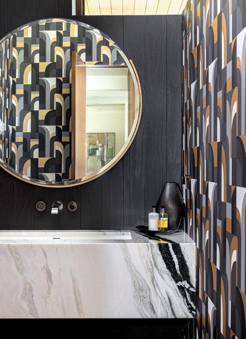 LOWER LEFT: A departure from the home’s more serene spaces, the powder room is cloaked in Caselio Labyrinth Doors wallpaper’s bold, graphic pattern. A floating black-and-white marble vanity and black mirror wall add depth and sculptural drama.