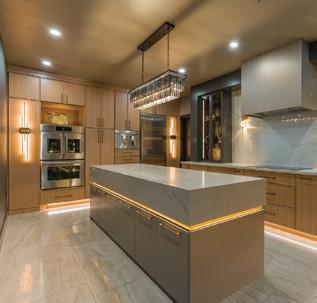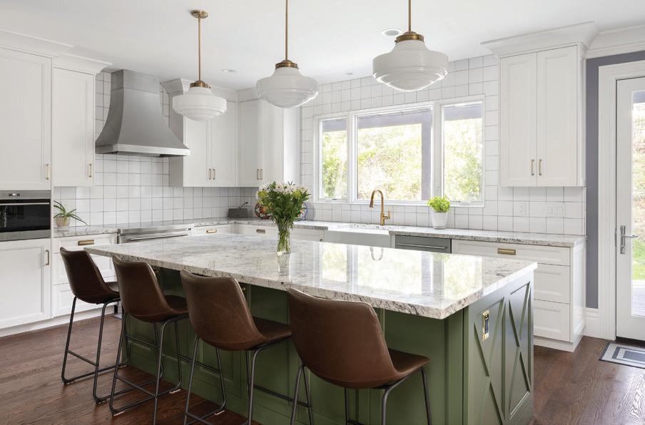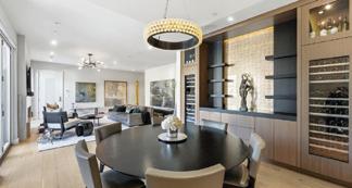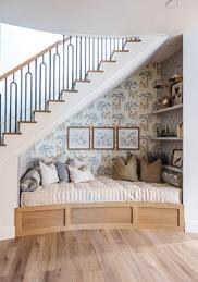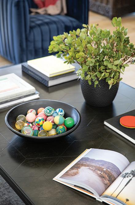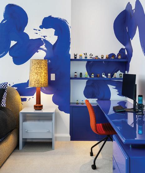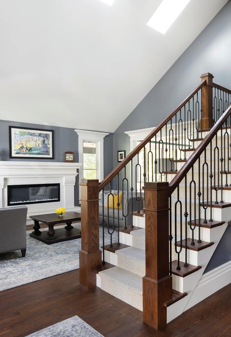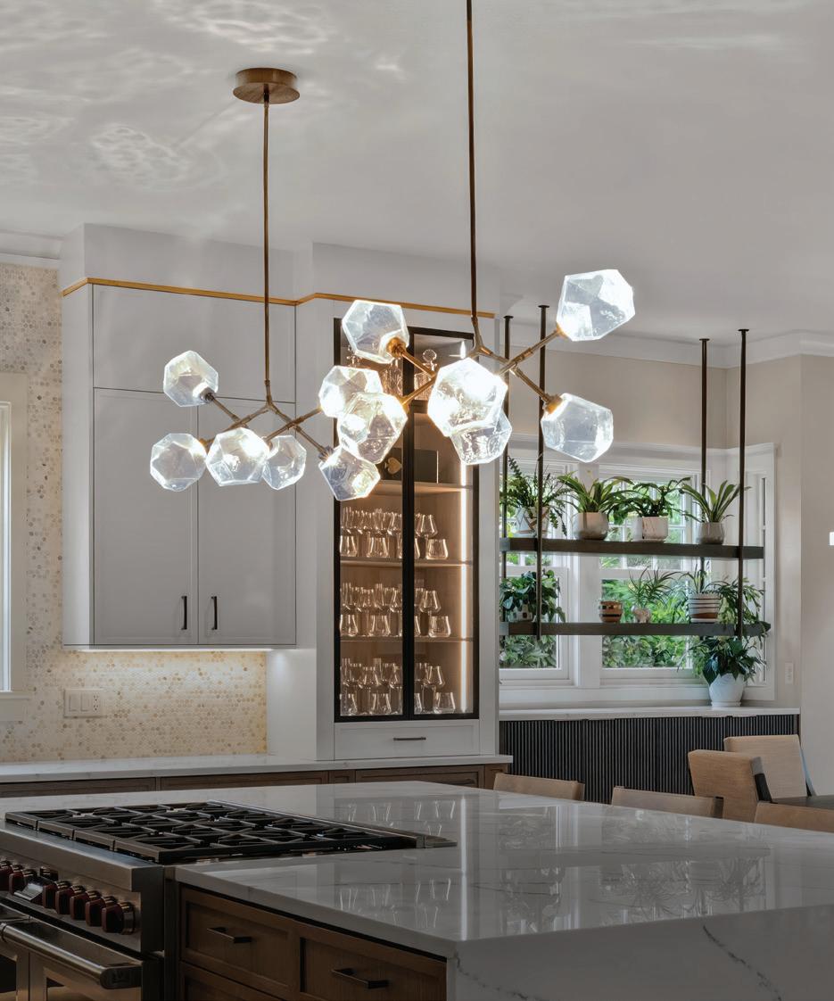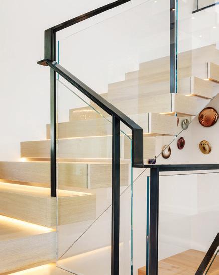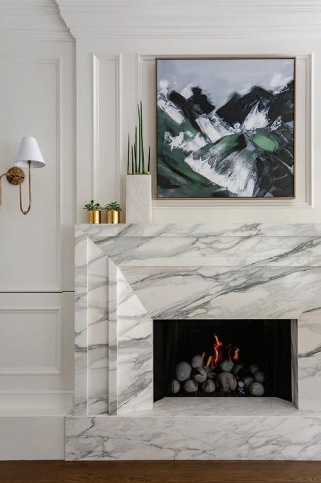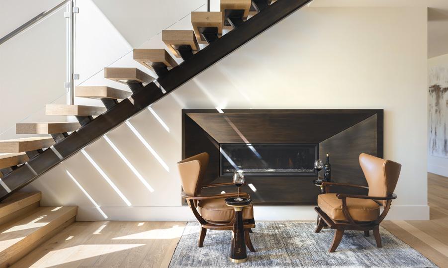 Downstairs, the mood shifts to relaxed family living. A sectional anchors the lounge, while a game table tucks beneath the staircase. Materials maintain continuity with a lighter touch. “We chose a dark brick and white oak for the built-ins and the fireplace surround. We added steel and glass to keep it light and airy in a normally darker space,” she adds. The same steeland-glass details on the nearby kitchenette ensure consistency across the space.