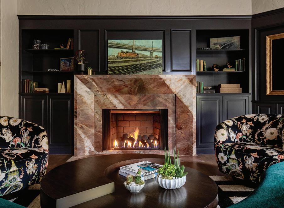 ABOVE: Designed to feel like a moody New York lounge, the den features original cabinetry painted deep black and a custom red stone fireplace surround fabricated by European Marble & Granite. A curved Holly Hunt sofa in emerald alpaca wool is paired with swivel chairs upholstered in whimsical Romo fabric.