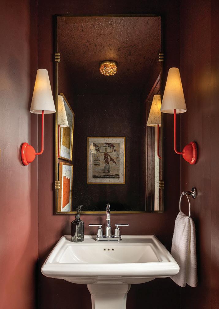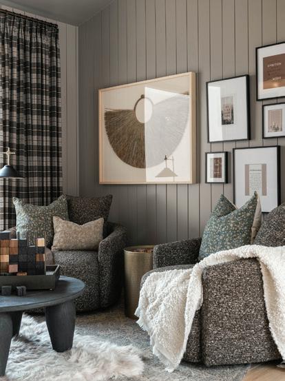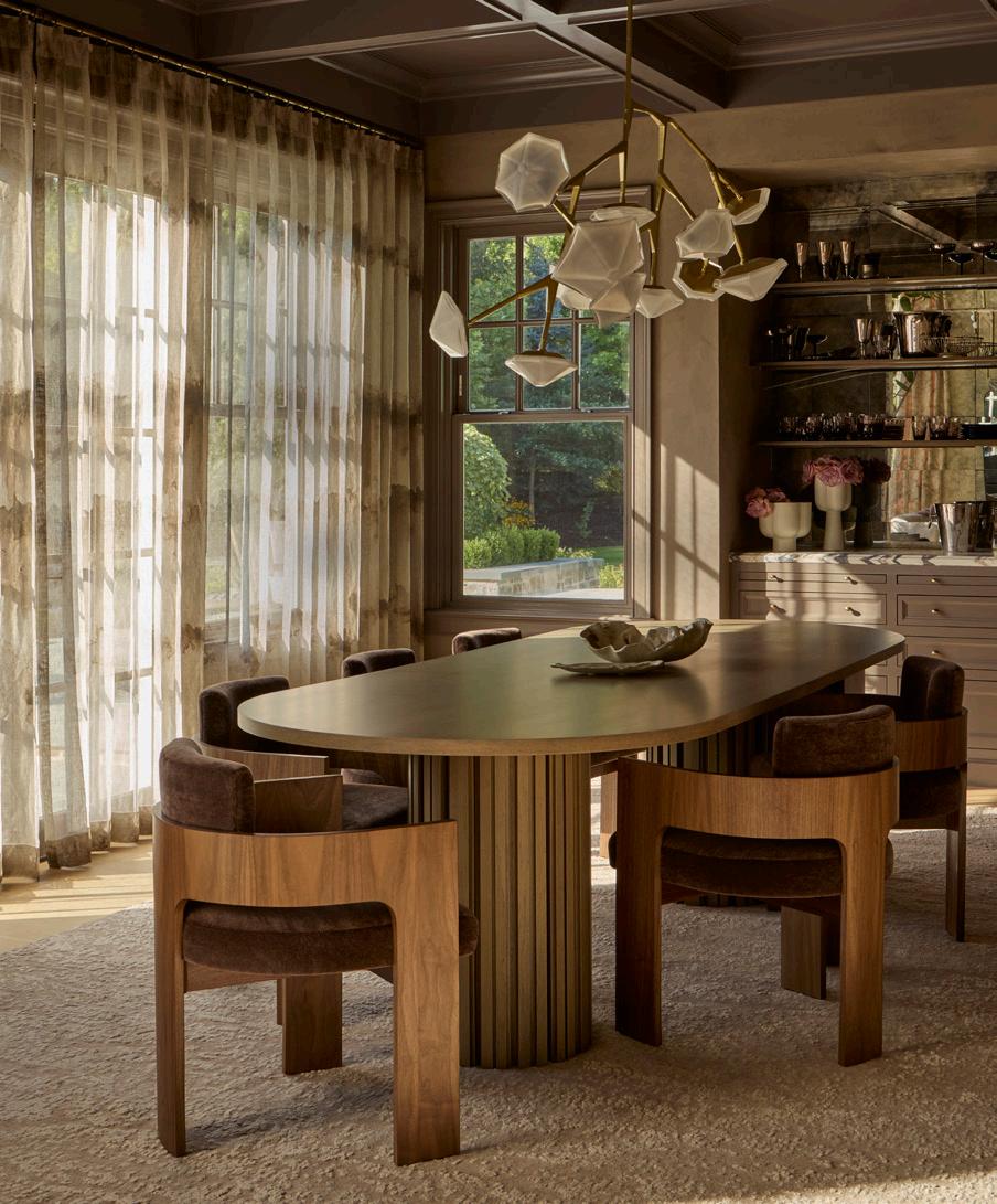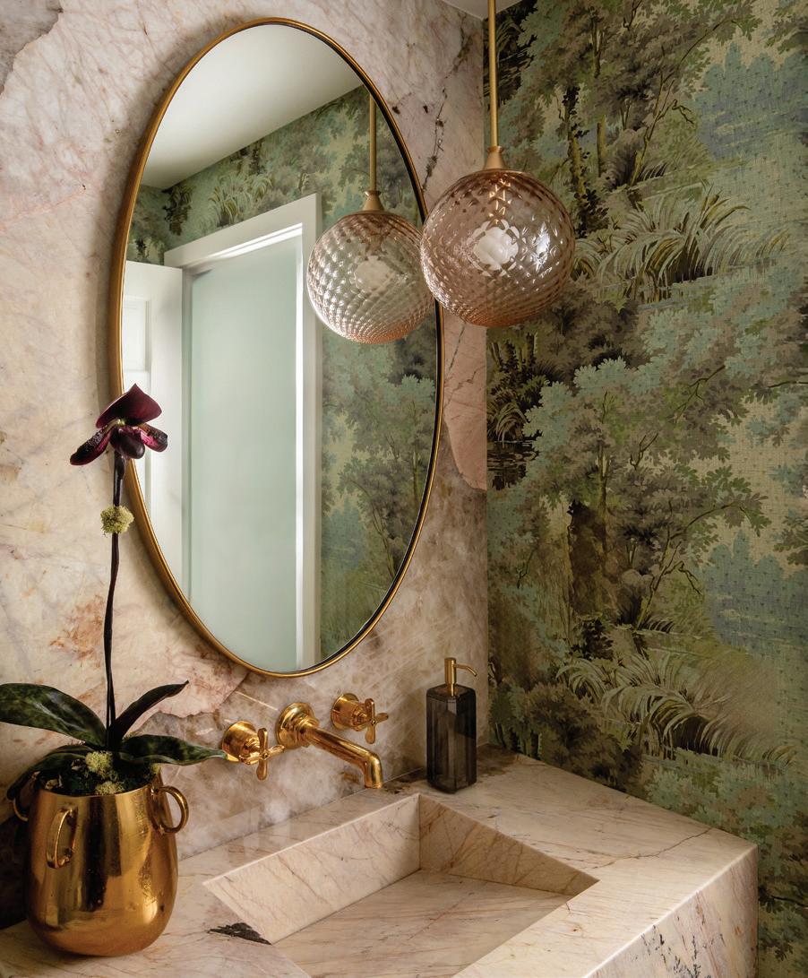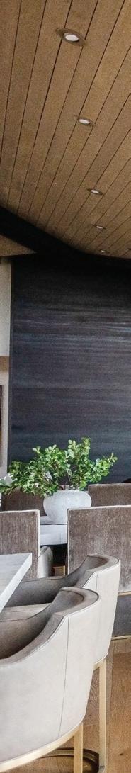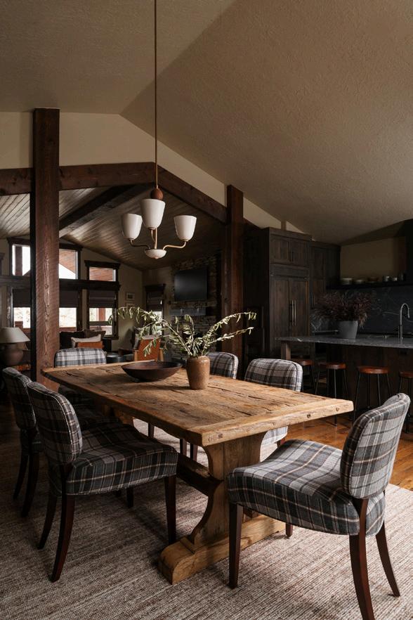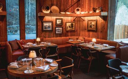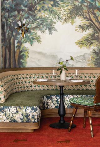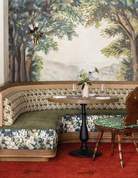 An enchanting, Austrianinspired atmosphere defines The Hirsch at Goldener Hirsch by Auberge in Deer Valley. Designed by Liubasha Rose, the dining room is wrapped in hand-painted Salzburginspired wallcovering, anchored by alpine-blue banquettes. Rustic tradition meets playful irreverence in this pattern-forward chalet, where every element nods to Rose’s European childhood: from forests and foraging to whimsical woodland characters. auberge.com/goldener-hirsch/dine/