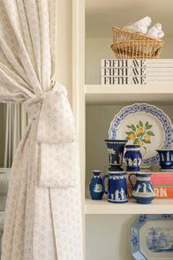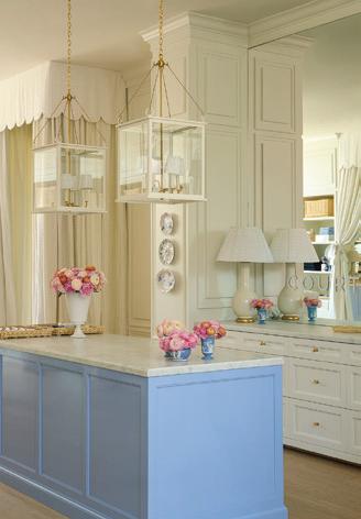 The moment you step inside, that precision becomes evident. Sharp millwork with contemporary angles, custom light fixtures and high-gloss finishes bring a modern edge to a soft periwinkle palette and delicate textiles. A whimsical floral print designed by Zwick appears on upholstered pieces and carries through to pillows, lampshades and small accessories Taylor has created for customers to bring the look home.