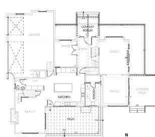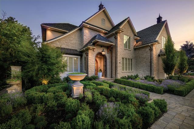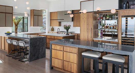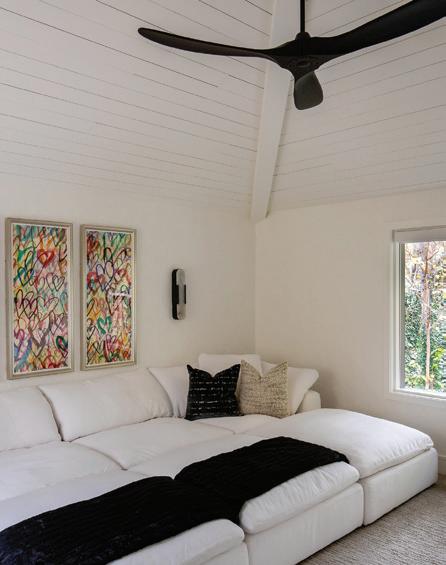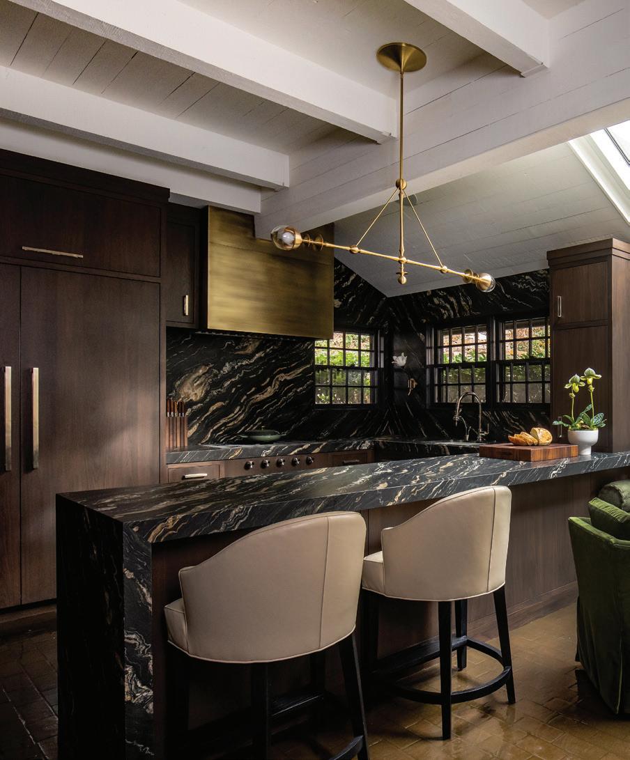 Inside the nearby light-filled great room, views extend outdoors to a serene Japaneseinspired Zen garden, where raked gravel suggests waves, and stones form the Big Dipper constellation—a celestial reference believed to draw cosmic energy while grounding the home within a larger natural order. Thoughtful decorating carries the garden’s calm energy indoors, creating a living space that feels both serene and continuous with its surroundings.