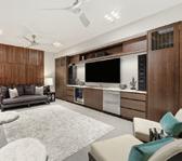 The lower-level family room is designed for adult children to gather, with a large Vanguard sectional, pool table, kitchenette and long shuffleboard table. Dark brick and white oak built-ins define the fireplace wall, anchoring a comfortable, multi-activity hub for conversation, TV and fun.
