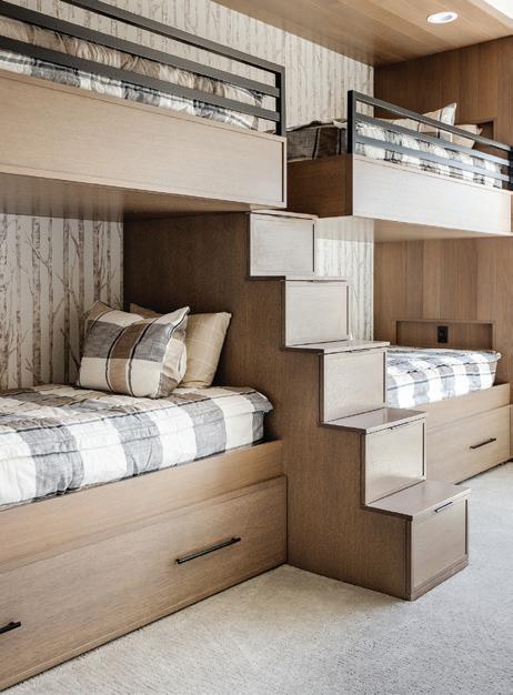 This bunk room sleeps six, with trundle beds for extra flexibility. Dark-stained rift white oak, aspen tree wallpaper and buffalo-check bedding create a cozy, playful vibe. Individual niches give each sleeper a spot for a cup or phone, while a central staircase—also functioning as storage drawers—makes accessing the top bunks safe and easy for kids and adults alike.