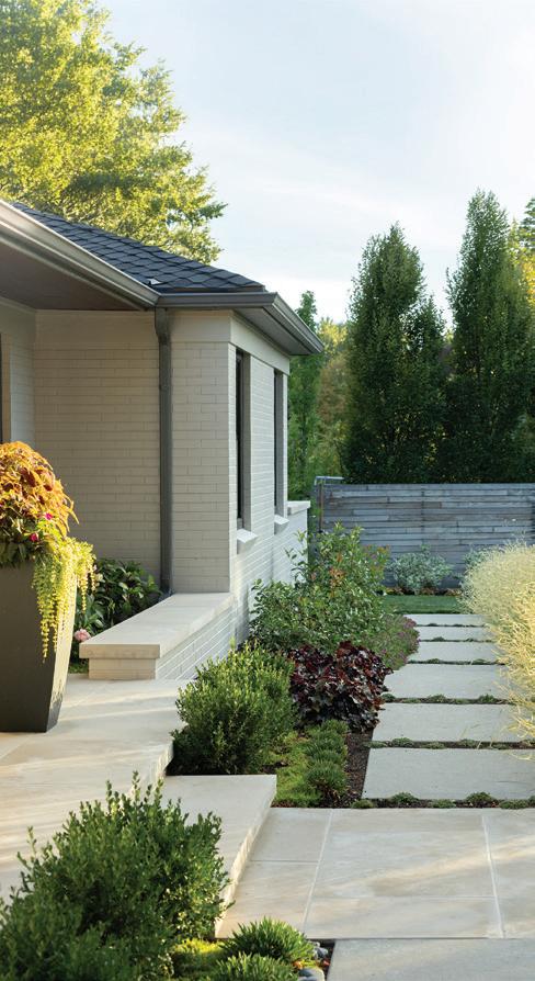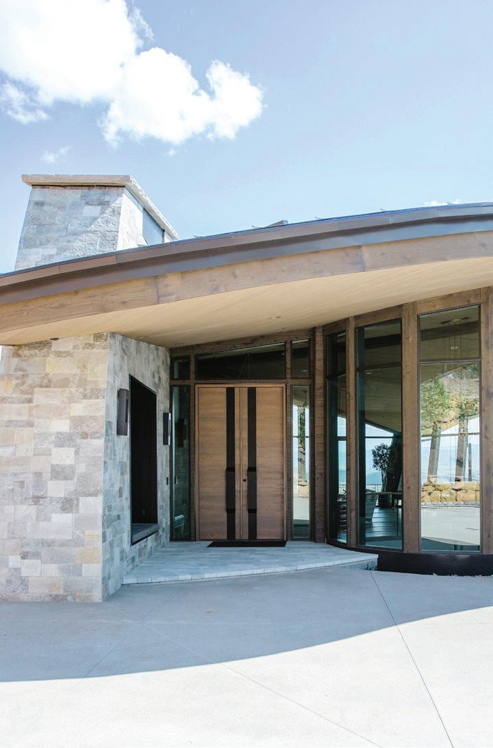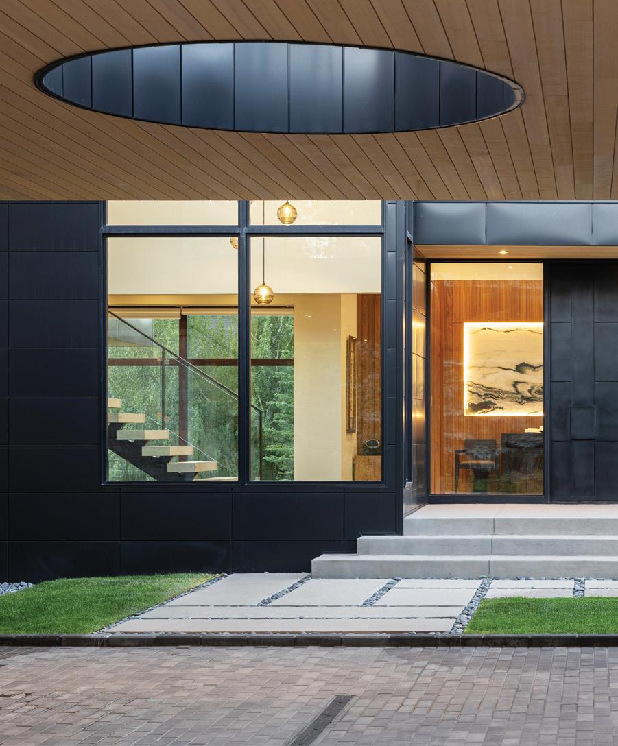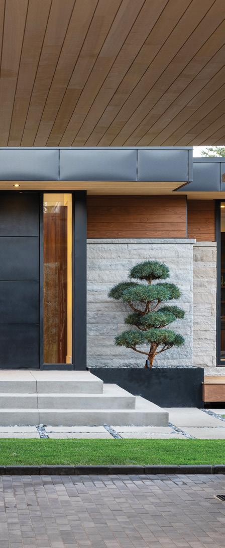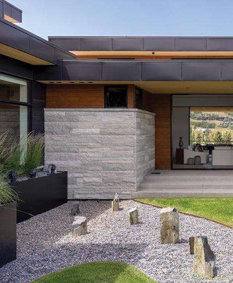 OPPOSITE: Pella Ashlar natural stone, hemlock siding and limestone panels define the home’s exterior palette, creating a layered, textural facade. The wood-and-steel front doors read like a piece of custom furniture, while a recessed, cushioned bench offers a sheltered moment of welcome.