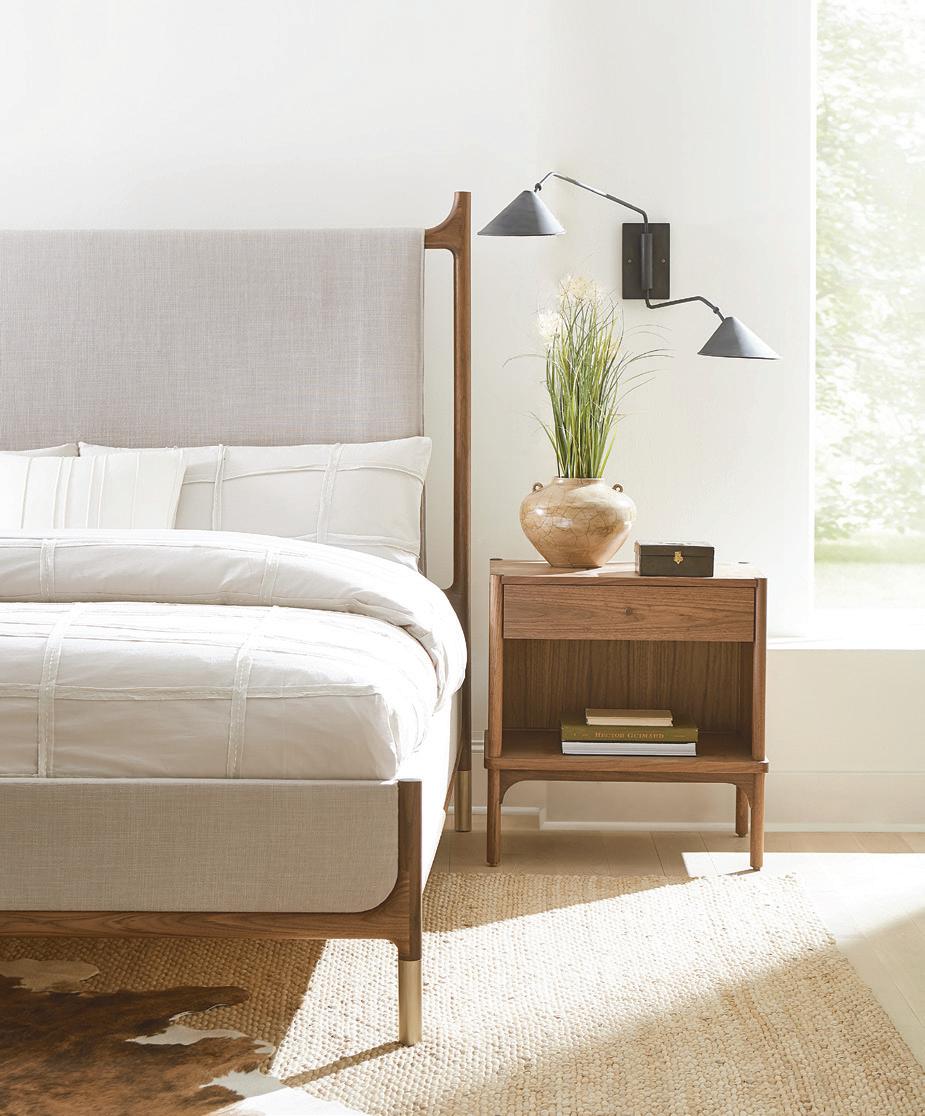 UPPER LEFT: Clean-lined walnut cabinetry and integrated appliances keep the kitchen space quiet and uncluttered, letting the warm wood detailing anchor the decor. Low-profile Verellen Butterfly counter stools maintain the streamlined aesthetic.