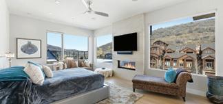 Builder: Falcon Crest Homes, falconcresthomesutah.com ; Architect: Greg Steffensen, gsteff-arch.com ; All Furnishings: Curate to the Trade, curatetothetrade.com —Upper and Lower Living Room Seating: Verellen, verellen.biz ; Living Room Cocktail Table: Alfonso Marina, alfonsomarina.com ; Rugs: Jaipur, jaipurrugs.com ; Console and Dining Tables: Old Biscayne, oldbiscaynedesigns.com ; Dining Chairs: Vanguard Furniture, vanguardfurniture.com ; Kitchen Stools: Verellen, verellen.biz ; Entry Chair: Baker Furniture, bakerfurniture.com ; Powder Wallcovering: JF Fabrics, Mirror: John Richard, johnrichard.com ; Primary Bench: Baker Furniture, Primary Bed and Nightstands: Chaddock, chaddock.com ; Mirror: Arteriors, arteriorshome.com ; Console: Hickory Chair, hickorychair.com ; Primary Wallcovering: JF Fabrics, jffabrics. com ; Primary Ottoman: Kravet, kravet.com ; Primary Bath Lighting: Lightology, lightology.com ; Primary Bath Bench: Vanguard Furniture, vanguardfurniture.com ; Lower Level Side Table: Theodore Alexander, theodorealexander.com ; Drinks Table: Currey & Company, curreyandcompany.com ; Sauna Bath Furnishings: Arteriors, Gloster, gloster.com