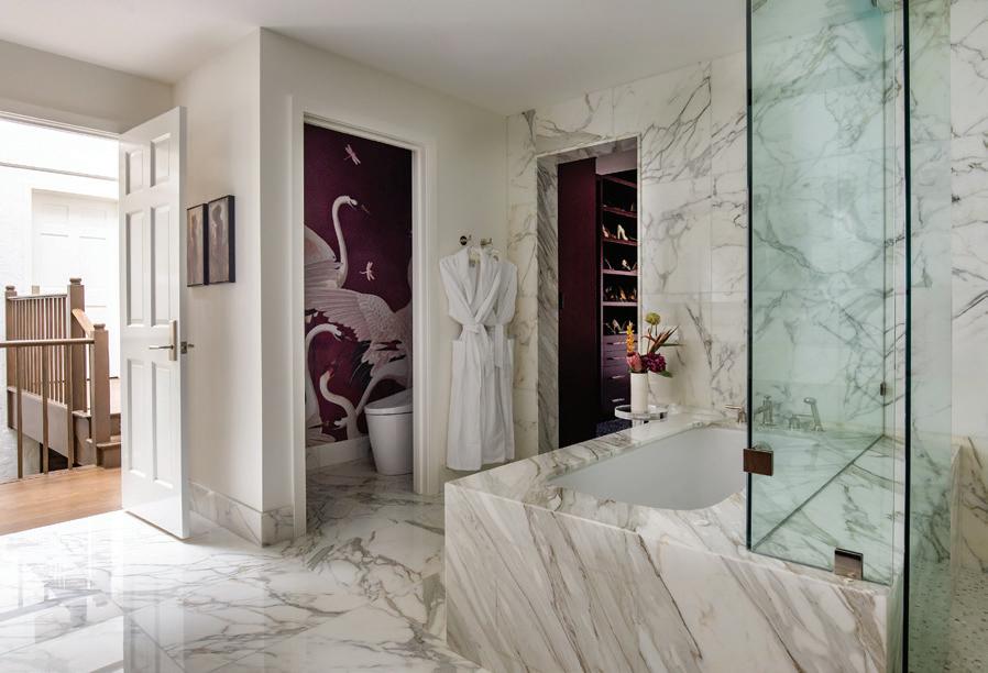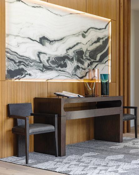 A lighted slab of Panda White marble enriches the entry, its flowing veining echoing the exterior fountain and supporting the continuous flow of qi. Designer Allison Parkinson layered the space with texture and warmth through a Baker Taper chair, Jaipur Rize rug and Old Biscayne Monique console.