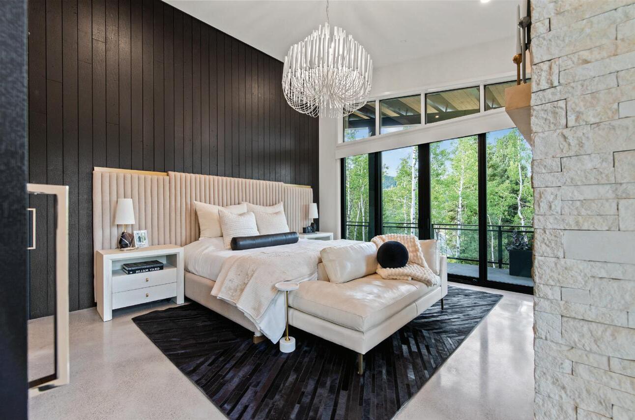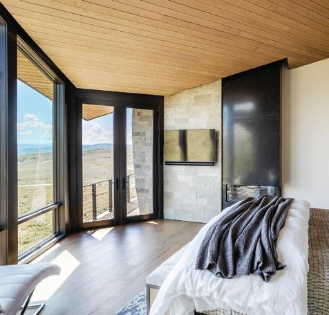 UPPER LEFT: Neutral finishes and wood-clad ceilings frame the primary bedroom’s views, while the fireplace’s stone and hot-rolled steel tie the suite to the home’s main spaces, adding warmth and continuity.