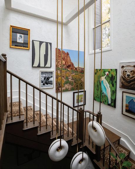 A skylight floods the refreshed central stairwell with light, where Holly Hunt pendants, a Stark Carpet runner and curated art by Lizzy Wenger and William Krastover deliver striking, personalized style.