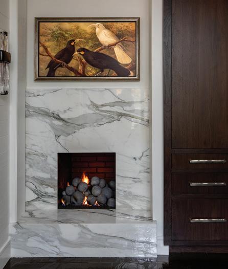 A petite Calacatta Black marble fireplace creates an intimate, unexpected focal point in the kitchen while echoing the home’s material palette.