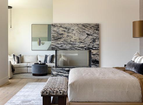 UPPER RIGHT: The primary bedroom unfolds beyond a striking stone fireplace and intimate sitting room, a layered approach that creates a peaceful buffer from the rest of the home and enhances the suite’s sense of privacy. A Baker bench and Gaetano bed anchor the luxe, restful retreat.