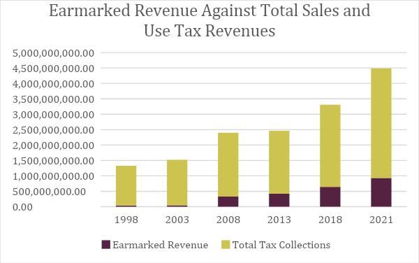Earmarks, generally, remained out of the sales tax revenue until 1990, when 1/64th of 1% was earmarked to the Olympic Special Revenue Fund. This earmark ended in 1999, however, earmarks have continued to grow and have taken a larger and larger portion of the state sales tax. In FY 2021, earmarks accounted for $929 million of the total sales and use tax revenues, which is approximately 26% of total revenue.