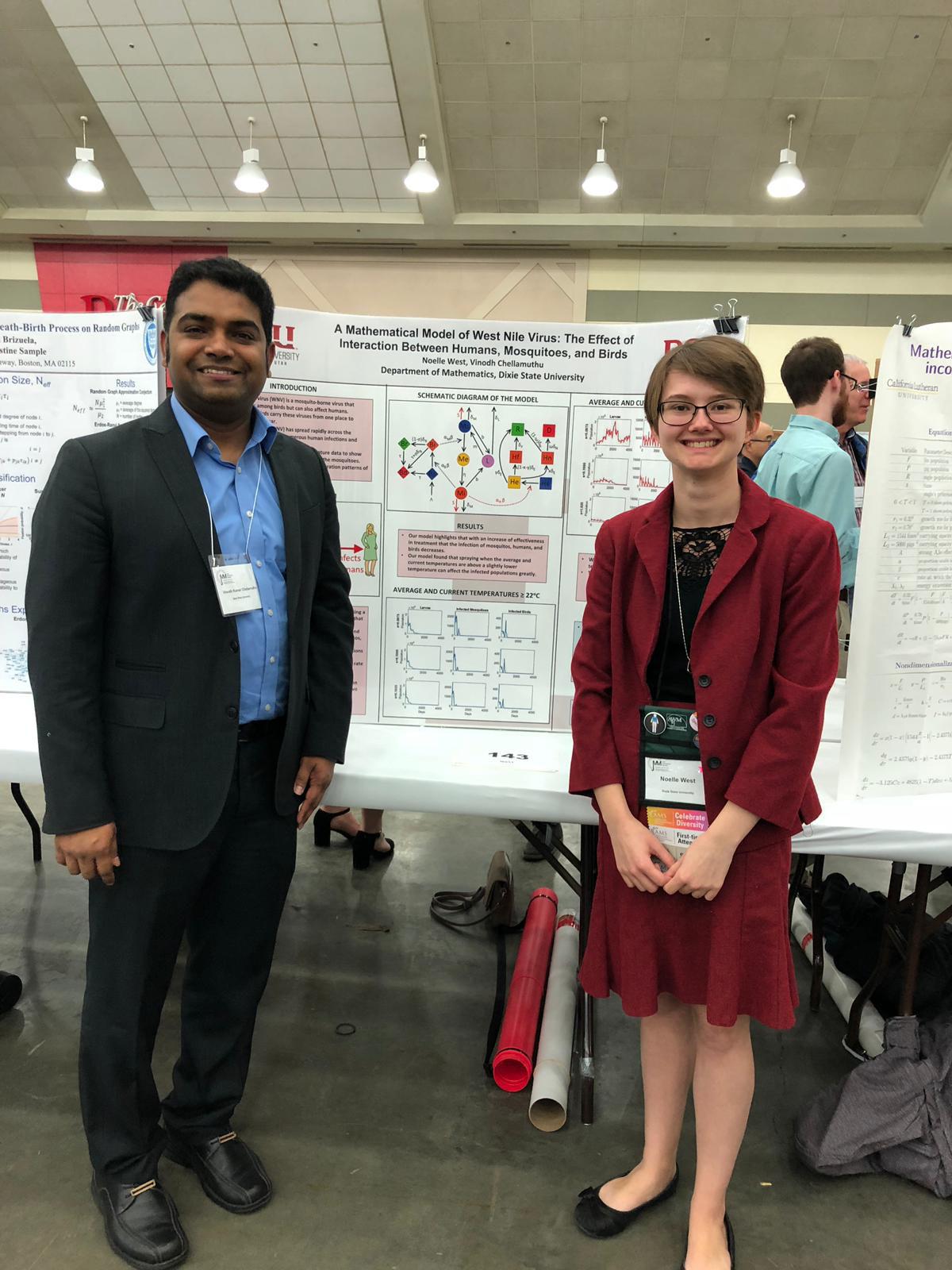 CHELLAMUTHU, VINODH KUMAR, Assistant Professor of Mathematics: Chellamuthu, V. K., & West, N., Modeling the effects of passive immunity in birds for the disease dynamics of West Nile virus, SPORA: A Journal of Biomathematics; Chellamuthu, V. K., et al., Somatic mutations in the DNA repairome in prostate cancers in African Americans and Caucasians, Nature, Oncogene; Peterson, C., Chellamuthu, V. K., & Lovell, J., Weighted Analytics - What do the numbers suggest; West, N., & Chellamuthu, V. K., Modeling the effects of passive immunity in birds for the disease dynamics of West Nile virus, Poster on the Hill, Washington DC; West, N., & Chellamuthu, V. K., A mathematical model of West Nile virus: The effects of passive immunity in birds and vertical transmission in mosquitoes, Utah Conference on Undergraduate Research; West, N., & Chellamuthu, V. K., A mathematical model of West Nile virus: