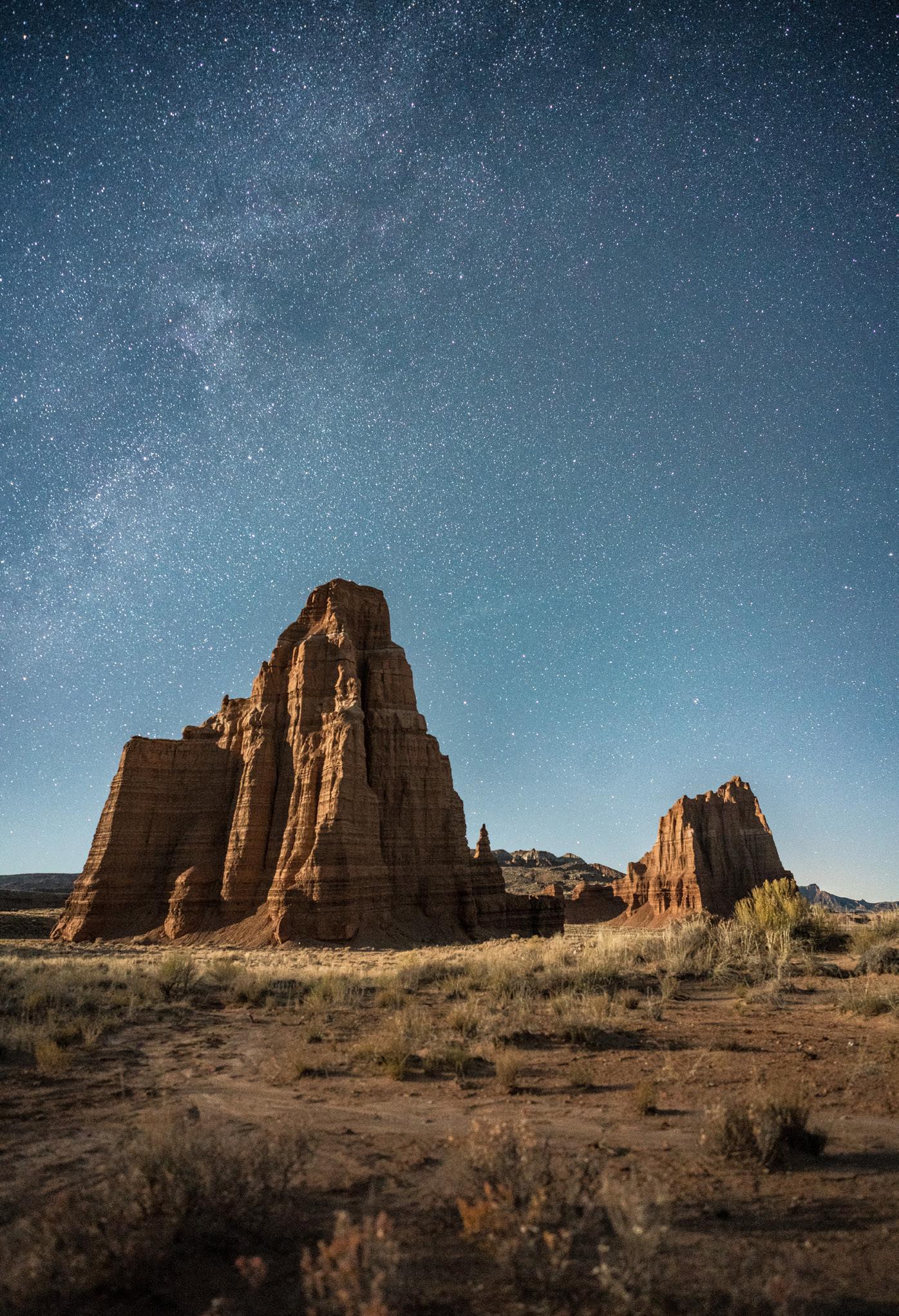 THE TEMPLES OF THE SUN AND MOON — “After my first visit to the temples in Capitol Reef, I knew I wanted to capture them in relation to their namesakes — one lit by the sun, the other by moonlight. I made it there with little time to spare before sunset, and once the first shot was taken, I couldn’t move the tripod for the next 16 hours so my shots would align perfectly. Other than a few catnaps and a little exploration, I spent the night next to my tripod, keeping my gear huddled in for warmth so it would still function. I had to revive my battery several times with my hands and the warmth of my breath just enough to get off a shot before it would freeze again. I hadn’t witnessed a sunrise here before, and to my surprise, the sunrise illuminates the entire Temple of the Sun before it strikes the Temple of the Moon. Sometimes things just work out.”