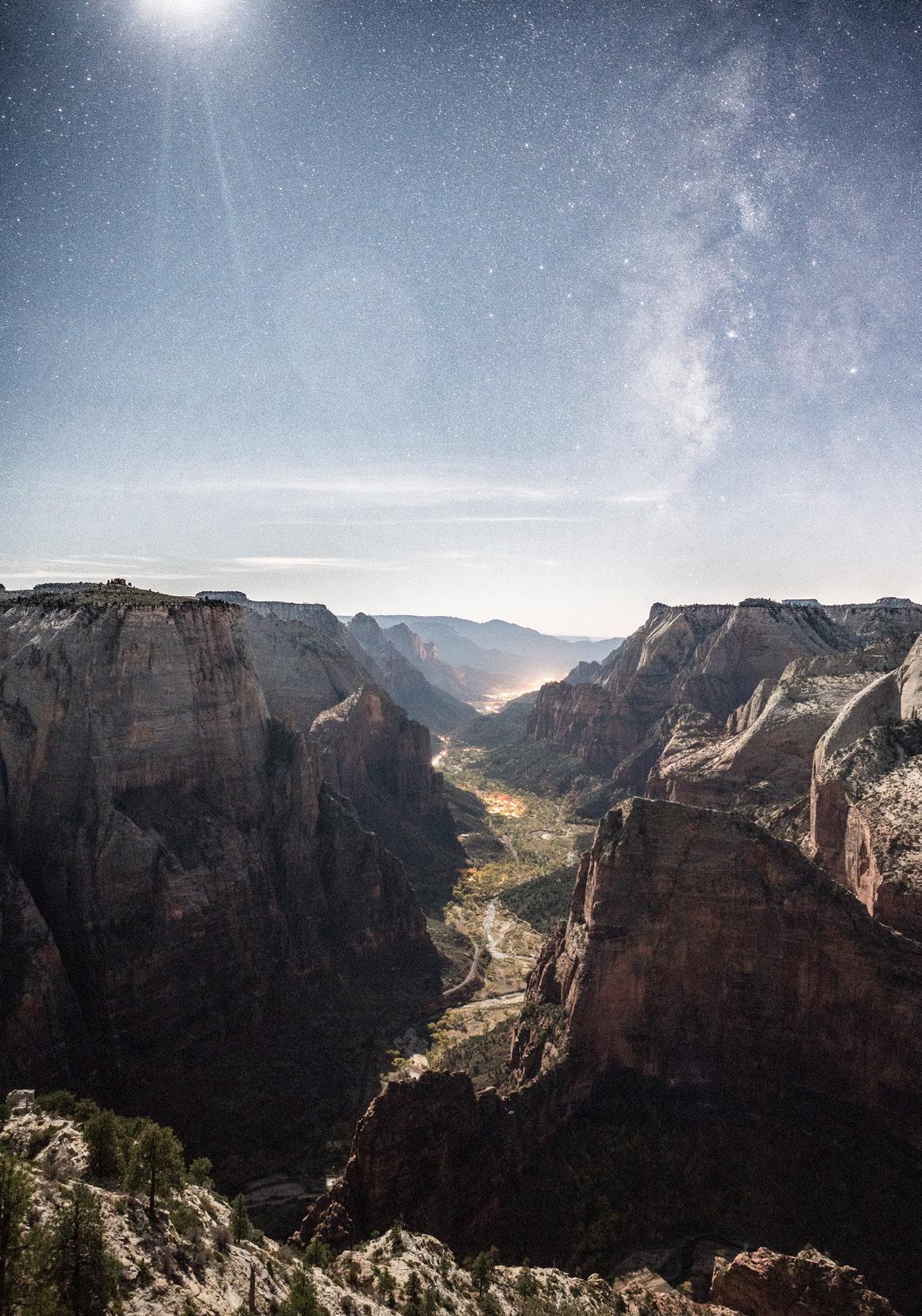 OBSERVATION POINT — “I’ve seen Observation Point in just about every condition. I’ve hiked it through the ice and snow, in rain, and summer sun. I’ve seen it at sunrise, midday, sunset, and through the night. Shooting it at sunset produced a familiar image with all the amazing colors of Zion, but the night shot shows it in a way most people don’t experience. I wanted to catch it under sunlight shining in one direction contrasted by the moonlight from the opposite direction. Zion feels very much like home to me, so it was an obvious inclusion to the series.”