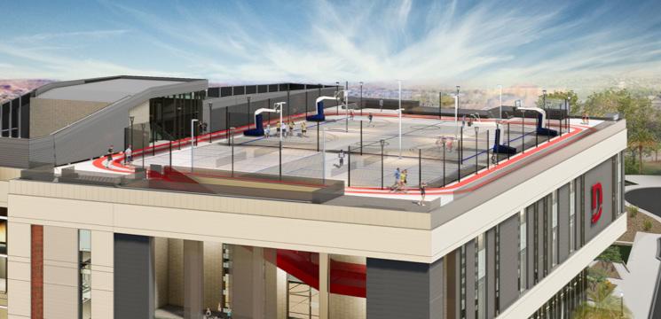 The Human Performance Center’s rooftop complex will be the only one of its kind in Utah. Housing pickleball and basketballs courts, as well as an outdoor running track, the rooftop complex will become a congregating place for students and the location of a variety of community and campus events.