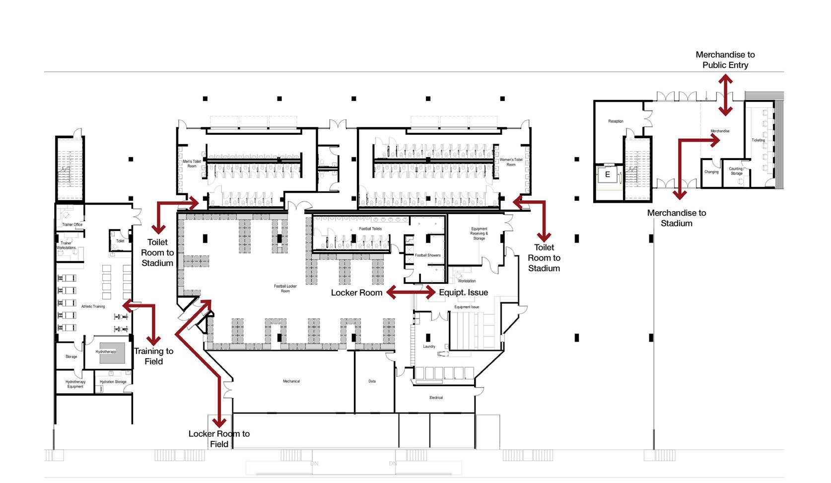 The 4,200 square foot locker room will be critical to recruiting the best student athletes. The layout of the locker room will allow for visibility from a central point for coaches and managers. It will be comfortable, durable, private, and secure for the student athletes. It will also house an athletic training facility, that includes taping tables, therapy tables, trainer workstations and a hydrotherapy pool that will serve as a compliment to the primary training facility north of the stadium.