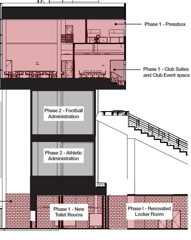 Renovation and expansion of the existing under-stadium building to improve the athletic training space, provide updated football team locker rooms and equipment issue facilities will also be included in the first phase.