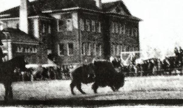 From left to right: Greg Layton, Matt Devore, Sarah Ramaker, Brooks the Bison, Ezra Hainsworth, Cajun Syrett, and Taylor Godfrey.