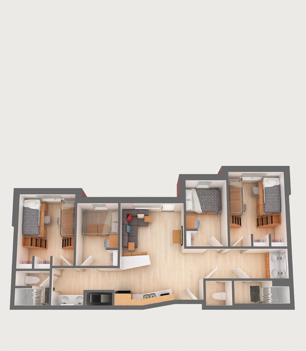Whether you choose to share a room or request a single, Campus View Suites II living spaces include a kitchenette, two bathrooms, and a shared living area that’s perfect for studying or hanging out with friends.
