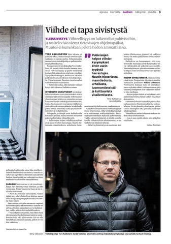 joutuu tilanteeseen, jossa ei voi tarkistaa tietoa. On noloa jäädä kiinni sivistymättö myydestä. Kalliolevo on huomannut, että van hemmille itsestään selvät kysymykset ei vät välttämättä ole selkeitä nuoremmille. Tämänhetkisessä yhteiskunnassa on tär keämpää osata soveltaa tietoa kuin päntätä sitä ulkoa. TIEDON SOVELTAMISTA pitää merkittä vänä myös Tampereen yliopiston media kulttuurin professori Mikko Lehtonen. Professorin mukaan tieto on yhteiskun nassa nykyään väline. Lehtonen sanoo, että tunteet ja mielipiteet ovat vallanneet tiedol ta tilaa mediassa. – Kertoo paljon tiedon arvostuksesta, että pääministerimme puhuu kaiken maailman dosenteista. Lehtonen haluaisi kuitenkin poistaa hai kailuasenteen yhteiskunnallisesta keskus telusta. Sivistyksestä puhuttaessa pitäisi katsoa eteenpäin eikä jahkailla vanhojen aikojen perään. Tietoähkyyn auttaa Lehtosen mukaan tie don oikea soveltaminen. – Jos ei osaa syödä oikein, niin ähkyhän siinä tulee. Aliisa Ristmeri LEEVI VÄHÄLÄ