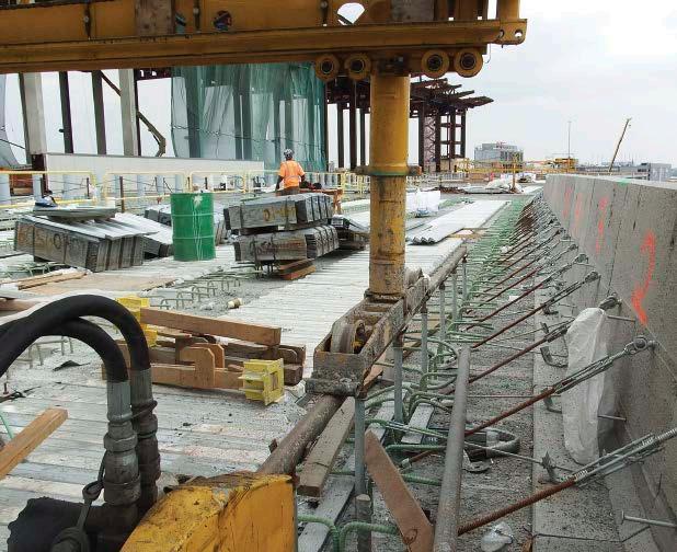 Skanska-Walsh crews were able to work safely from the bridge deck at LaGuardia, focusing on connecting the hardware properly. Each Precasteel section is equipped with two ties, one of which is redundant. Even in a worst-case scenario where a heavy load bangs into a panel, it would break rather than fall. This was proven on the last barrier pour on a section installed more than 6 months before barrier concrete placement. Precasteel panels at LaGuardia were designed to withstand all anticipated construction and OSHA loads with up to six times the factor of safety on deck pours and two times on barrier pours; the current standards have increased safety factors even more to facilitate the usage of pick brackets attached to the panels on the inside to allow workers to move freely up and down the line of panels and to account for reverse stresses that could be implied on the panels during slip forming operations.