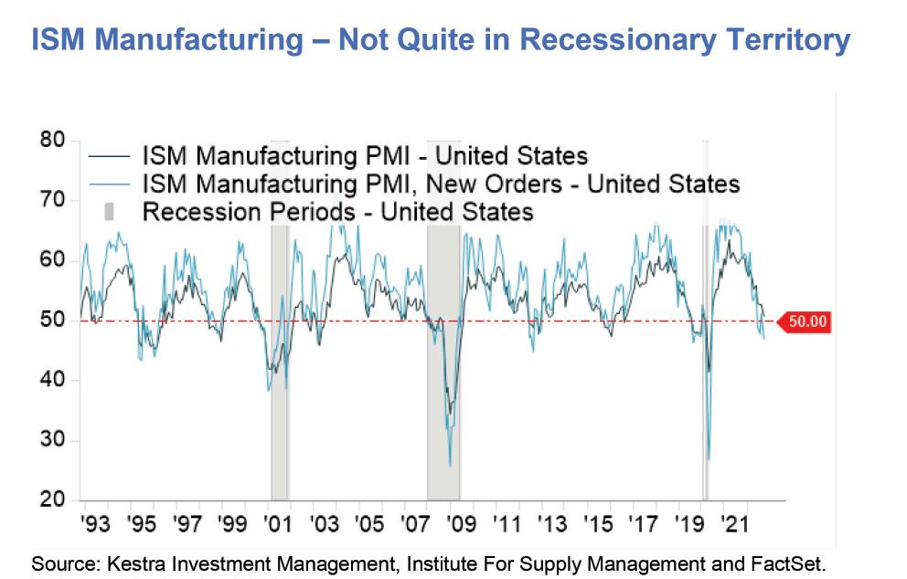 If the yield curve tells us that a recession is coming, the ISM is telling us not quite yet. But if the downward momentum that we have seen over the last few months continues, it would suggest we could see an official recession by the first half of 2023.