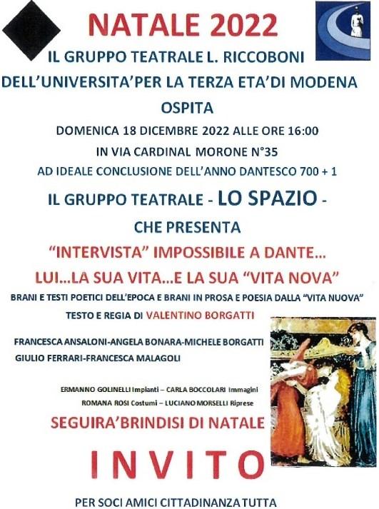 Il tradizionale “Natale Insieme” si è svolto con tre significativi momenti: il Concerto della nostra Corale Estense alla chiesa del Voto; una mattinata in Cardinal Morone con “Tante lingue e un solo augurio di Buon Natale”, tra viaggi, racconti e musiche sul palcoscenico docenti e corsisti UTE; ed infine una rappresentazione teatrale con “Intervista impossibile a Dante” testo e regia del docente UTE Valentino Borgatti.