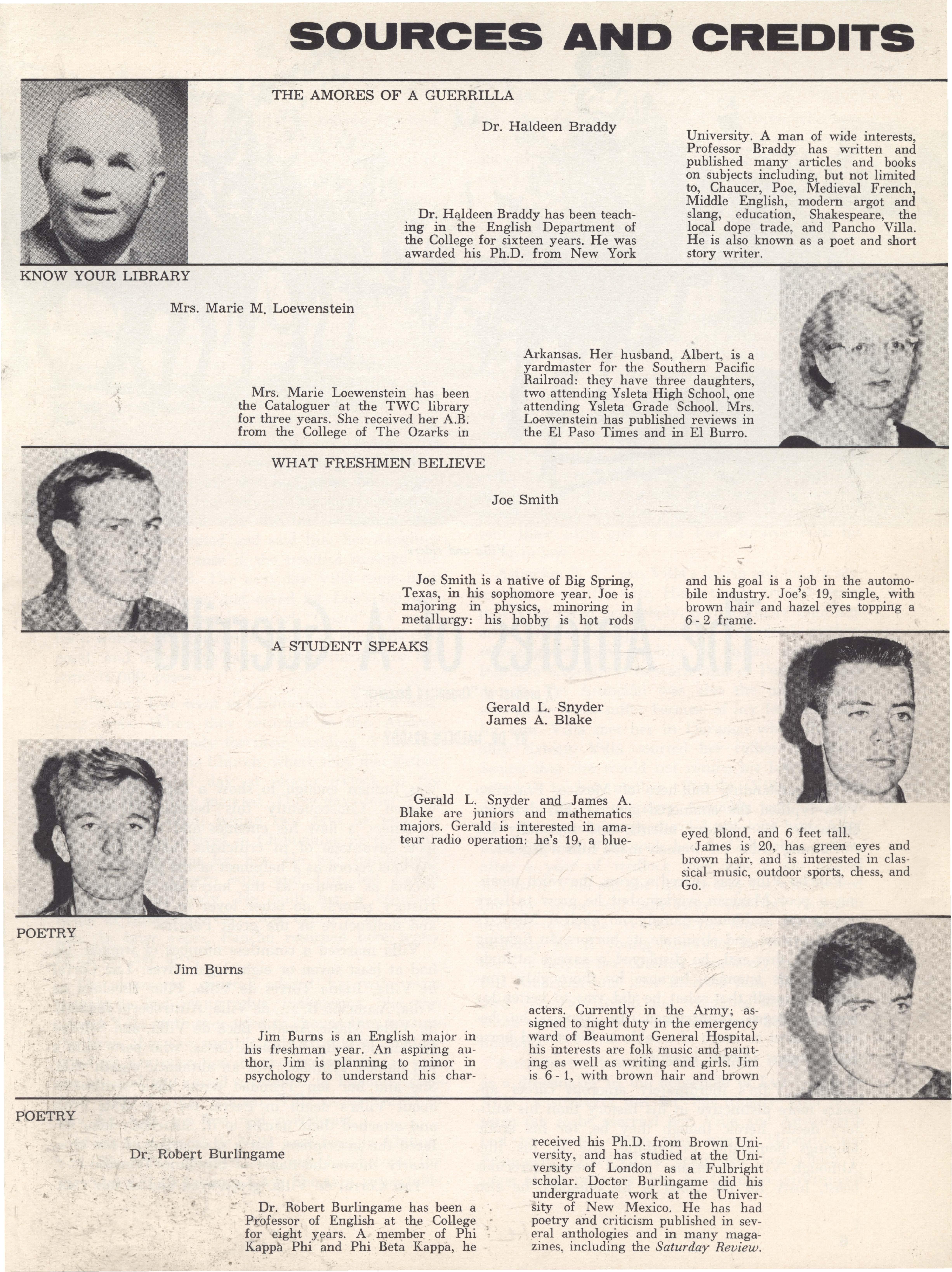 Unsolicited manuscripts, photographs or art may be delivered to the EL BURRO office, SUB 401. Address all correspondence to the Editor, EL BURRO, P. 0. Box 153 Texas Western College, El Paso, Texas. No responsibility can be assumed for unsolicited material. If manuscript js to be returned by mail, enclose self -a d d r e s s e d stamped envelope.