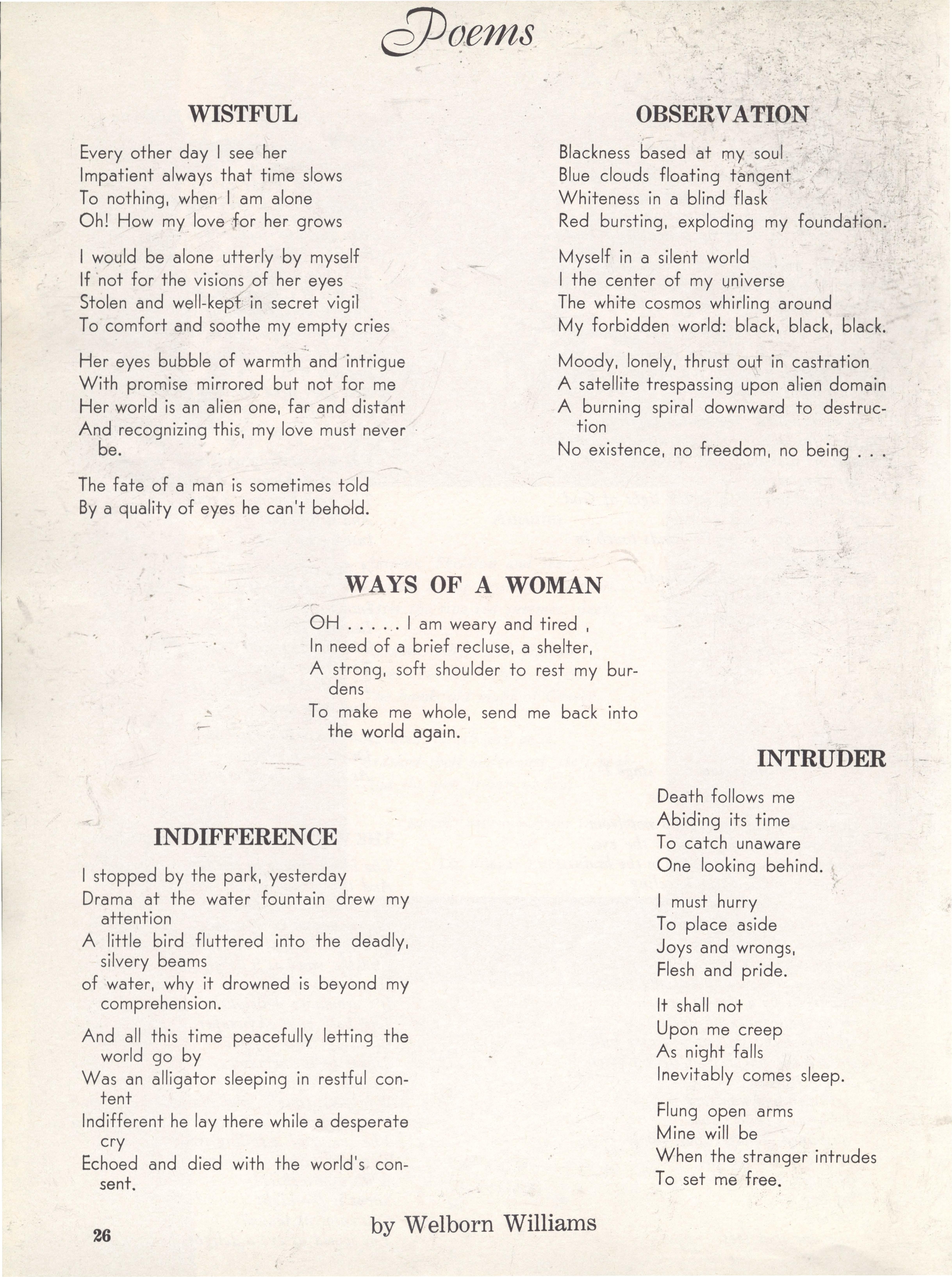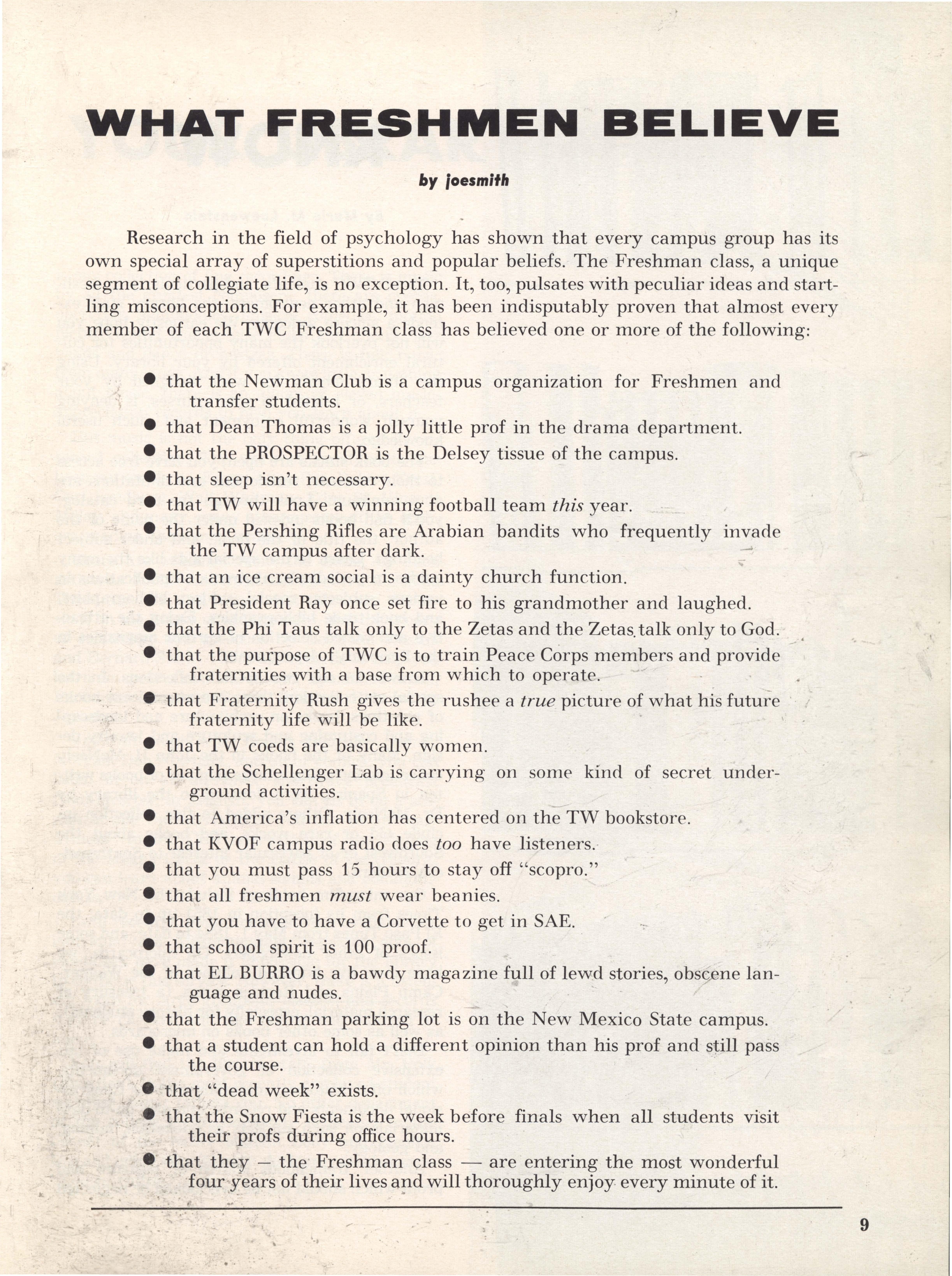 THE PRESIDENT OF TWC 2 A MESSAGE FROM THE PRESIDENT s EDITORIAL COMMENT 4 CREDITS AND SOURCES 5 THE AMORES OF A GUERRILLA 6 WHAT FRESHMEN BELIEVE 9 KNOW YOUR LIBRARY 10 SEPTEMBER! 12 A SONNET FOR SEPTEMBER 13 A STUDENT SPEAKS 14