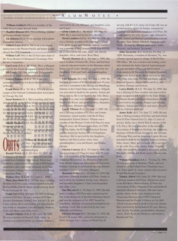 • serving with the U.S. Army Air Corps. He was an architectural designer for homes, commercial buildings and apartment complexes in El Paso. He is survived by his wife, Jeanne; sons, Edward Jr., Frank, Robert and Michael; grandchildren, Edward III, Tom, Tara, Marah, Mitchell, Seam, Lourdes, Vitria, Michael Jr., Morgan and Laurie; sister, Marjorie; and husband, Raymond. John Navarrete (B.S.'64;M.Ed.'69) May 23, 1999. Navarrete, a resident of Herndon, Va., was a former special agent in charge of the El Paso FBI office. He was a mentor and reading coach who initiated the Junior Special Agent program. He was president of the Law Enforcement Association in El Paso and the Federal Executive Employees Association. He is survived by his wife. Olga; sons, John, Michael and Danny; parents, Jose and Jgnacia; sisters, Ofelia and Eva; and brothers, Enrique and Ernesto. Laura Riddle (B.S.N. '98) June 23, 1999. She was a lifelong El Paso resident who had worked as an occupational therapist for the State Center for Mental Health and Mental Retardation. Riddle is survived by her parents, Raquel and Antonia; brothers, Antonio and David; and sisters, Raquel, Sylvia, Gabriela and Lisa. James Kelly (B.S. '51) June 27, 1999. He had been a lifelong resident of El Paso and had retired from El Paso Natural Gas Co. after 21 years of service. Kelly was a World War II veteran of the U.S. Navy. He was a member of the American Association of Petroleum Geology, the American Institute of Professional Geologists, the Veterans of Foreign Wars and the American Legion. He was preceded in death by his daughter, Rebecca; brother, John; sisters, Mary and Gertrude. He is survived by his wife, Eve; sons, James. Kelly, Timothy. Eddie, Ben and Billy; daughters, Jacqueline, Karen, Elizabeth, Debbie and Ruth; sisters, Eleanor and Ruth. WiUiam Flenniken (B.B.A. '72) June 22, 1999. He was a resident of Spokane, Wash .. and was retired from McCollum Ford. Flenniken was a U.S. Navy and U.S. Army veteran who served in World War II and Vietnam.x Tommy Alford (NG) June 28, 1999. She was a lifelong resident of El Paso. Alford was active in the Rio Bravo Watercolorists. El Paso Art Association, El Paso Museum of Art and Goodwill Industries Board of Directors. She also was a painter whose works were displayed at the Americana Museum, the UTEP Centennial Museum and the People's Gallery at City Hall. Alford was preceded in death by her son, Duane. She is survived by her husband of 49 years, Harvey; sons, Kevin, Wyndom; grandchildren. Brandon, Aaron, Tyler, Ryan and Madison; and brothers, Ronald and Van.