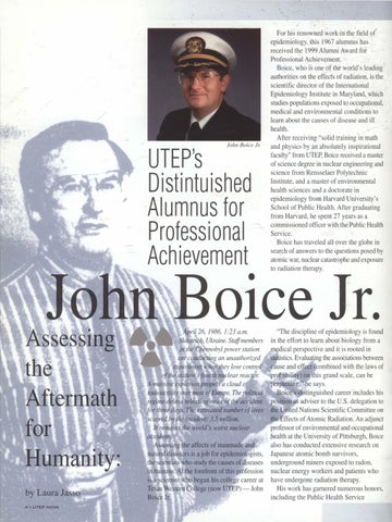 April 26, 1986. 1:23 a.m. Slavutych, Ukraine. Staffmembers in the Chernobyl power station are conducting an unauthorized experiment when they lose control of the station's fourth nuclear reactor. A massive explosion propels a cloud of radioactivity over most ofEurope. The political regime delays releasing news of the accident for three days. The estimated number of lives scarred by the incident: 3.5 million. lt remains the world's worst nuclear accident. Assessing the affects of manmade and natural disasters is a job for epidemiologists, the scientists who study the causes of diseases in humans. At the forefront of this profession is a scientist who began his college career at Texas Western College (now UTEP) - John Boice Jr.