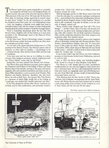 he Moores' adobe home squats majestically on a secluded, tree-ringed lot off North Loop and Zaragosa Roads, ruling all it surveys. One part of the structure has been dated to 1806 and most of the rest of it is 150 years old. Its three-footthick walls, its towering ceilings supported by ancient vigas, its main doors "locked" by the old expediency of a wooden bar dropped across their seam, the cool whitewashed rooms - here, one imagines, a Spanish envoy might have lived in splendid isolation with only the whisper of water rhythmically running along the nearby acequia to break the viceregal silence. There is something disquieting about the fact that Tom Moore's home, freighted with all that history, is in such close proximity to the Whataburger stand in the Plaza de Flores shopping center. On the other hand, Moore's Winnebago camper is parked in the dirt driveway outside his house and there are other; stranger; passages-across-time inside. On one wall of the grand step-down living room is a 1750 painting of San Ramon Nonato, New Mexico's patron saint of midwives; on other walls are retablos - oil paintings on tin - of Santa Liberata, Mary and the Christ Child, and Our Lady of Guadalupe. A few steps away and one step up, in a hallway, in a place of honor; there hangs an enormous, vertical, original pen-andink "Prince Valiant" comic strip by Hal Foster. Seeing this, you have entered Tom Moore's true domain. Tom Moore drew some hilarious one-panel cartoon gags for the Prospector and El Burro in his College of Mines and Texas Western days in the mid-40s, serving on the paper and humor magazine with such excellent journalism and writer people as Nancy Miller (Hamilton), Lucky Leverett, Scott Thurber; Mike Martinez and Hawley Richeson. Hamilton, who also knew Moore (as well as Ruth Kurz, who became Mrs. Tom Moore) as a classmate at Austin High, recalls him at the College as "a quiet guy, very modest but a terrific cartoonist even then:路 In the Navy during the Korean War; Moore continued cartooning, now for Navy publications, and eventually created a