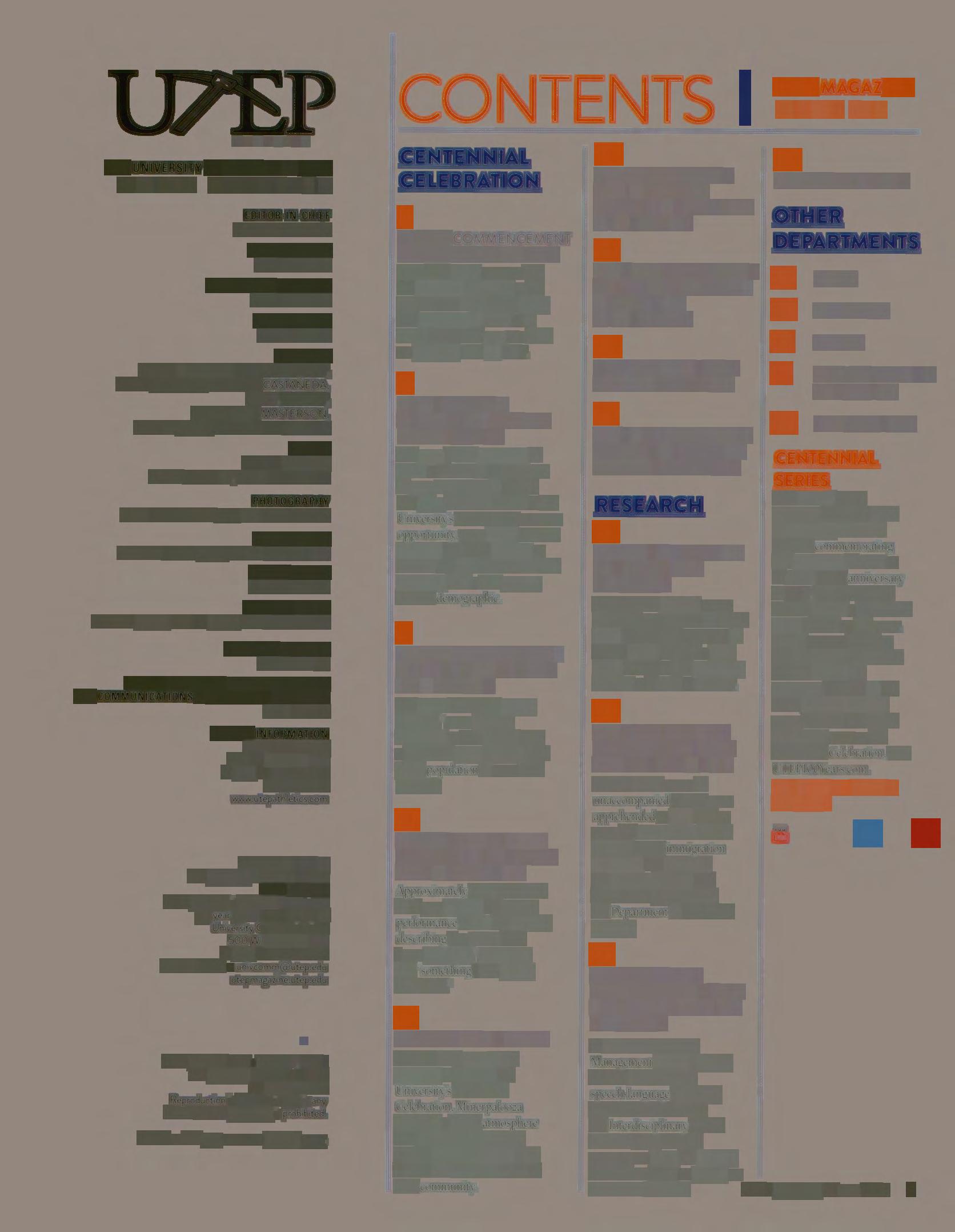 This issue of UTEP Magazine marks the six th of six special collector's editions commemorating The Universny ofTexas al El Paso's 100th anniversary in 2014. Each Centennial edition features a Centennial Series banner on the cover. In side, content related to the Cen tenn ial Celebration fills the front of the magazine, followed by the other features, research, news, athletics and alums' stories. For more on th e Centennial Celebration, visil UTEPlO0Years.com.