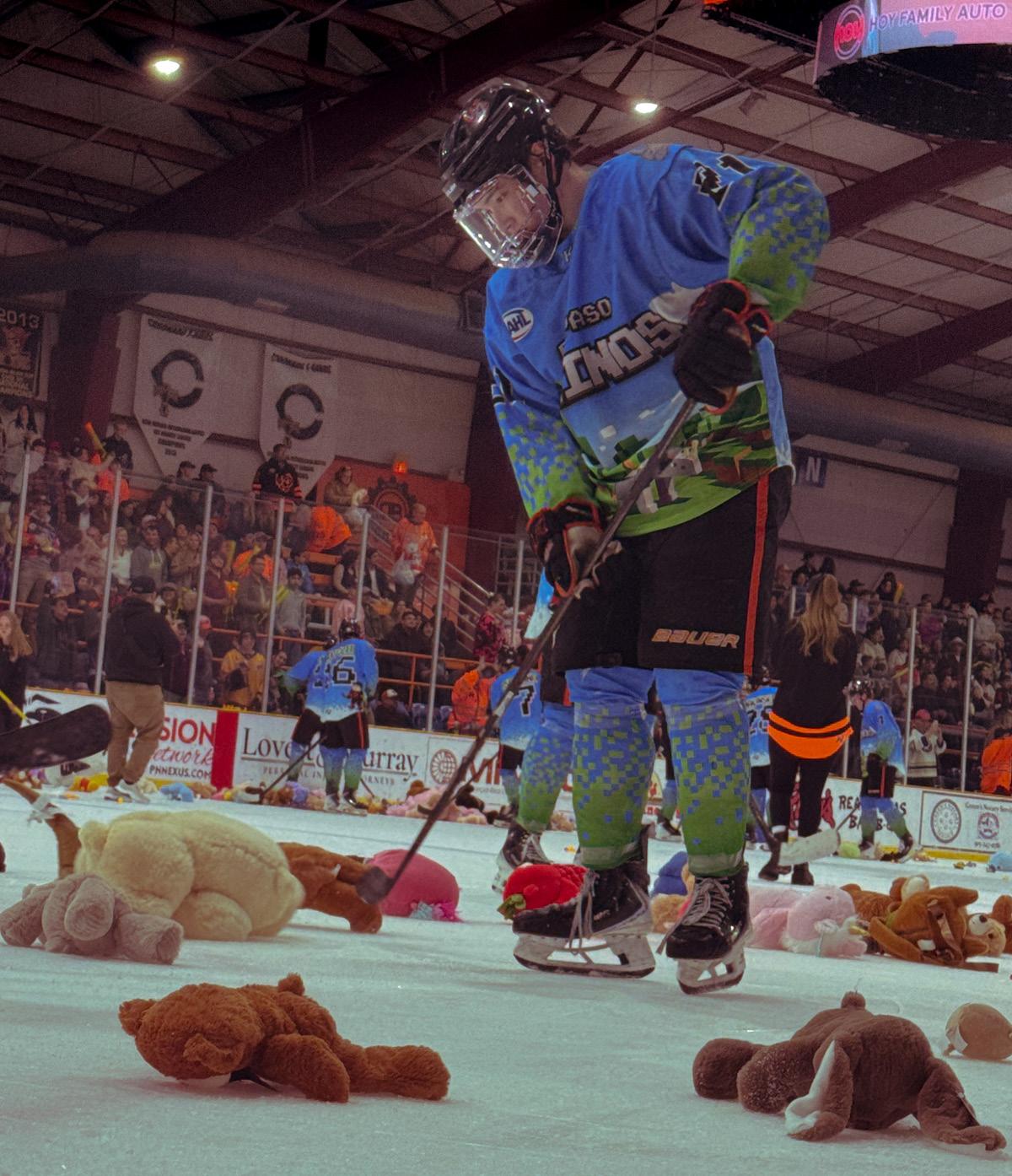 El Paso Rhinos Hockey team continues the tradition of throwing teddy bears for charity started by the Kamloops Blazers of the Western Hockey League in 1993. Photo by Dustin Perez/The Prospector