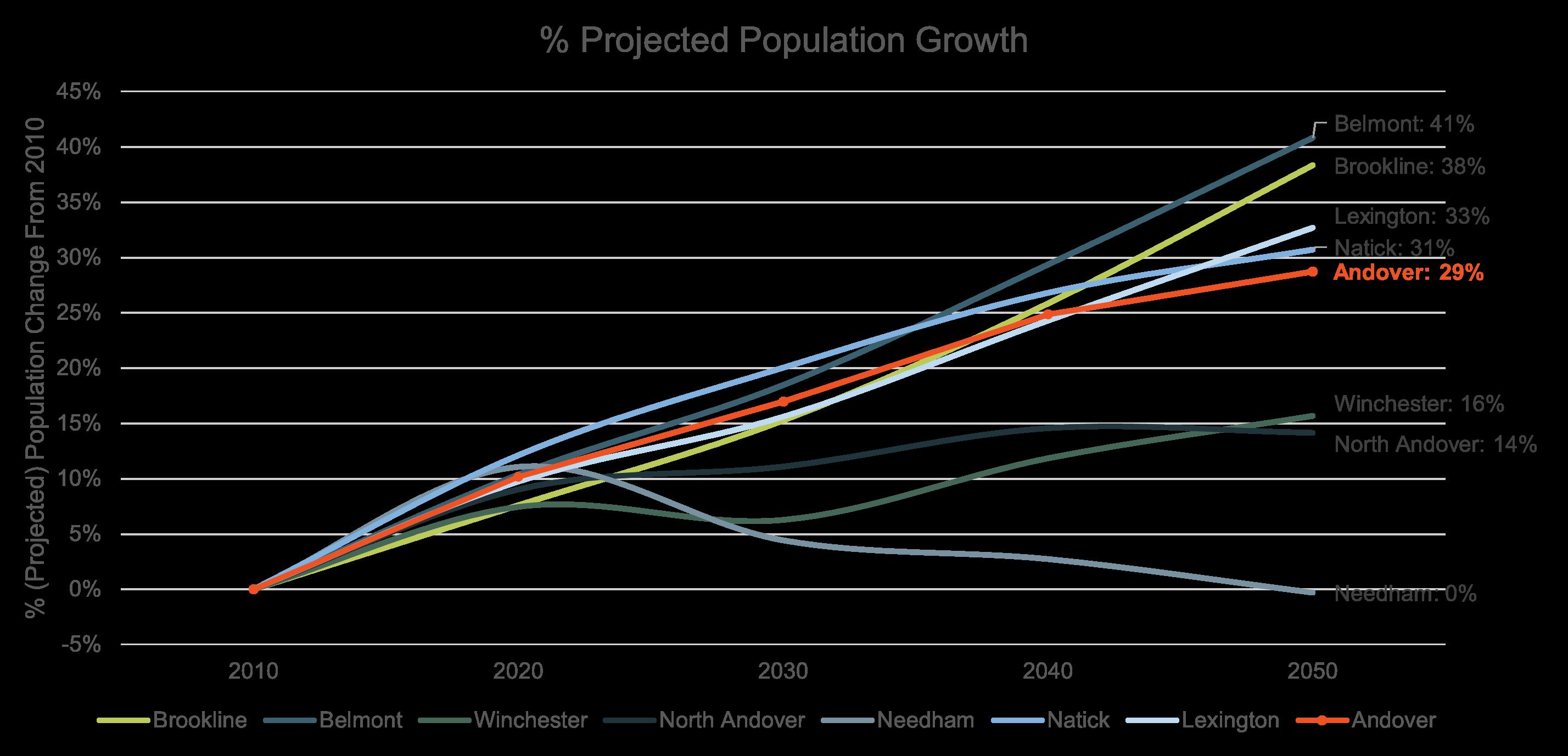 Andover’s population growth in recent decades mirrors many of its peer communities, and projections for its future population growth follow the same pattern. In many ways, this “middle of the pack” pattern relative to those communities (shown above both in terms of absolute and relative percentage change since 2010 and projected out until 2050), show that the regional demographic shift will likely affect Andover in a way that is similar to many other communities. Andover will continue to grow, as will its surrounding and similar towns and cities. While it is impossible to perfectly predict the future, general projections suggest that this growth will continue in the coming decades as well.
