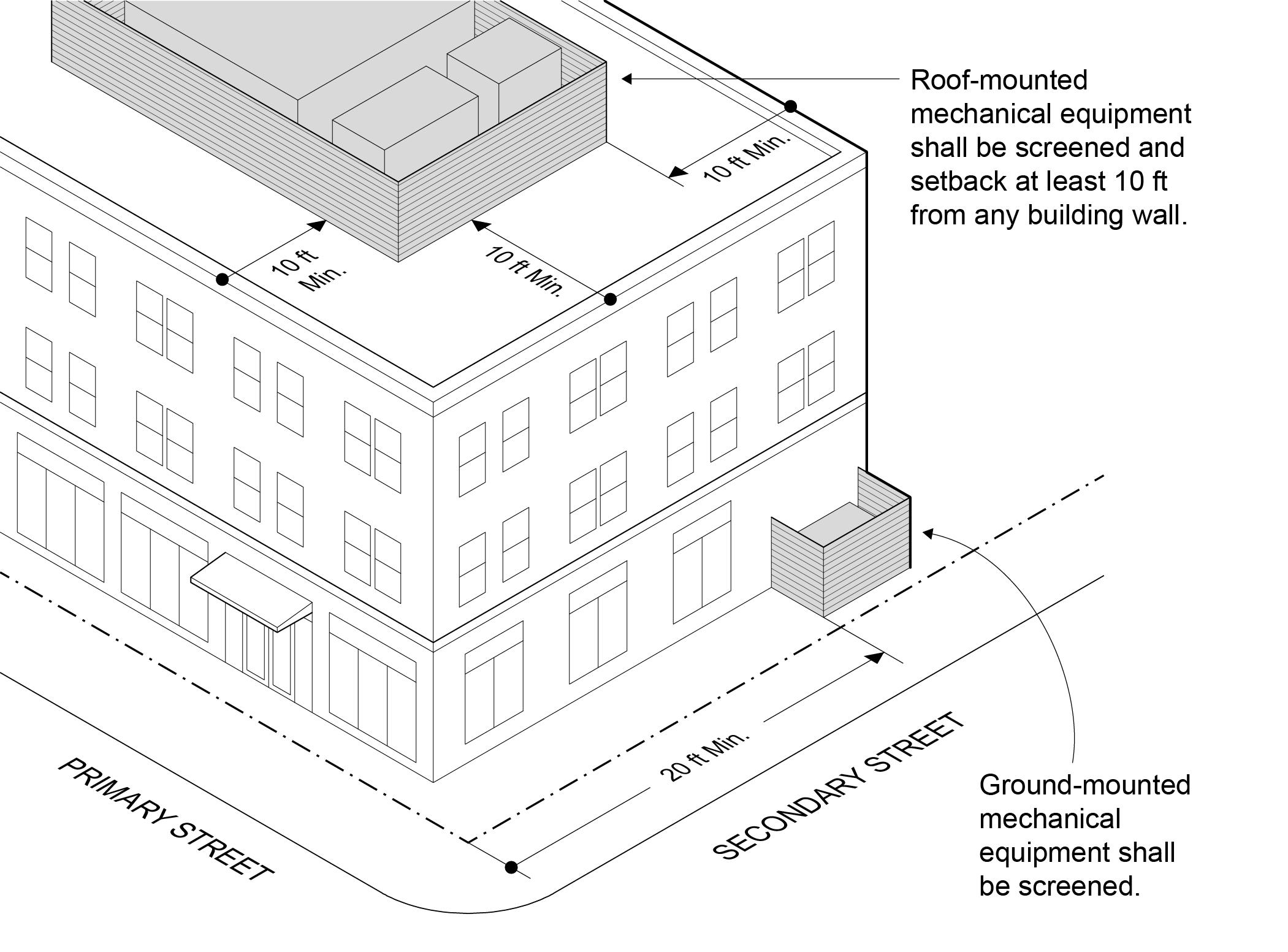 a. Roof-mounted mechanical equipment must be screened and setback at least ten (10) feet from any building wall. See “Screening” in §300-5 Terms defined.