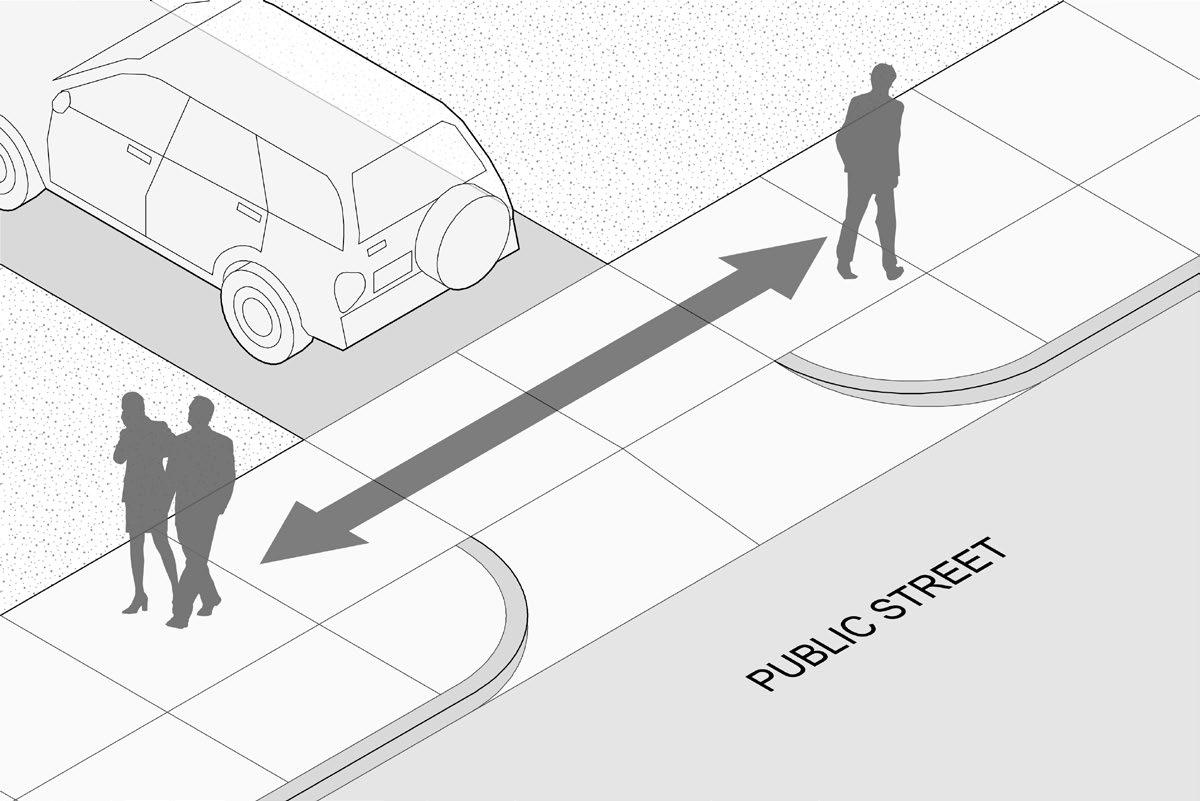 e. The grade, cross slope, and clear width of the walkway of a sidewalk must be maintained between the driveway apron and the abutting driveway. The appearance of the walkway (i.e., scoring pattern or paving material) must indicate that, although a vehicle may cross, the area traversed by a vehicle remains part of the pedestrian sidewalk (Fig. 12).